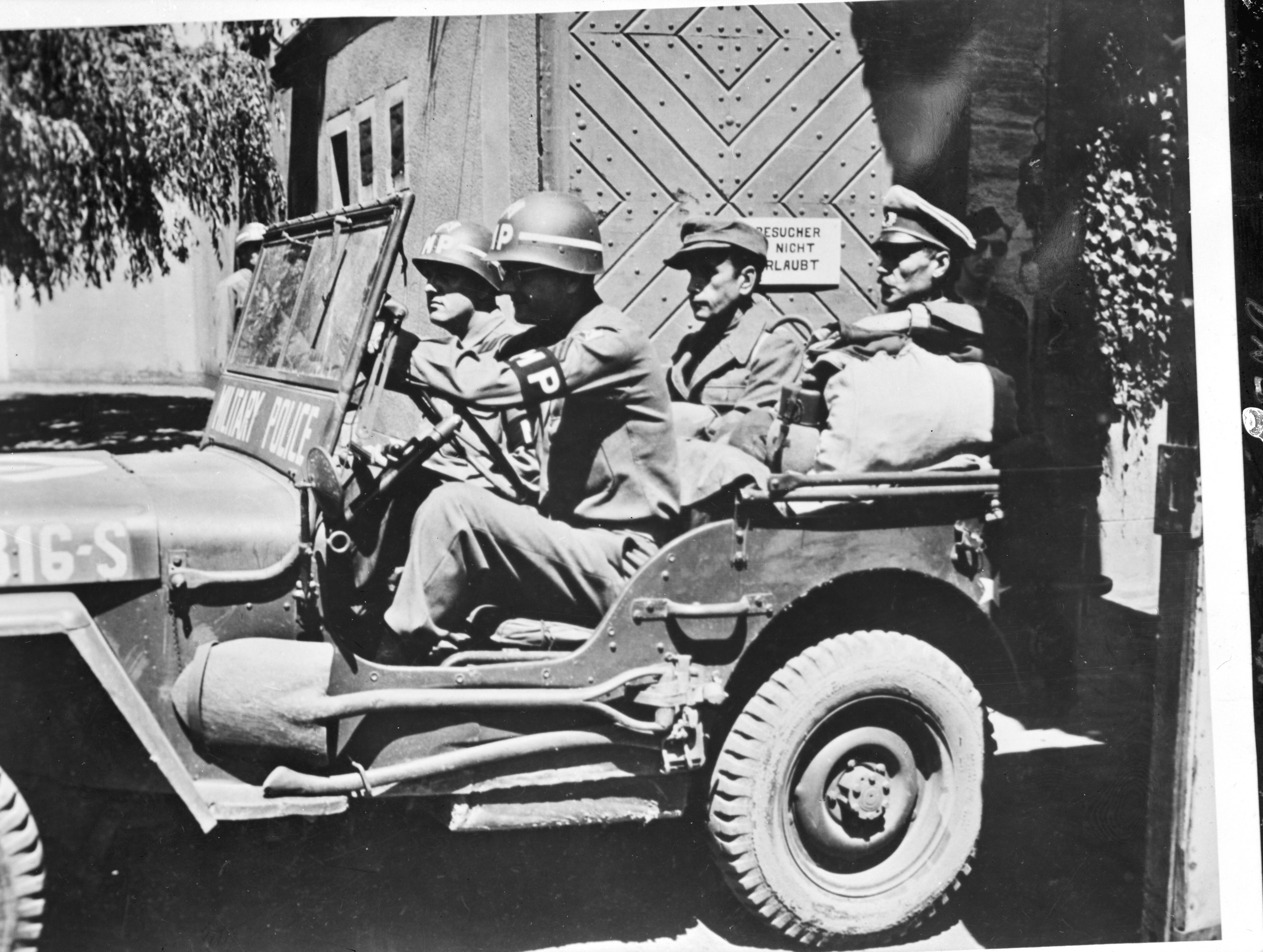 Duitse kampbewaarders worden afgevoerd per jeep