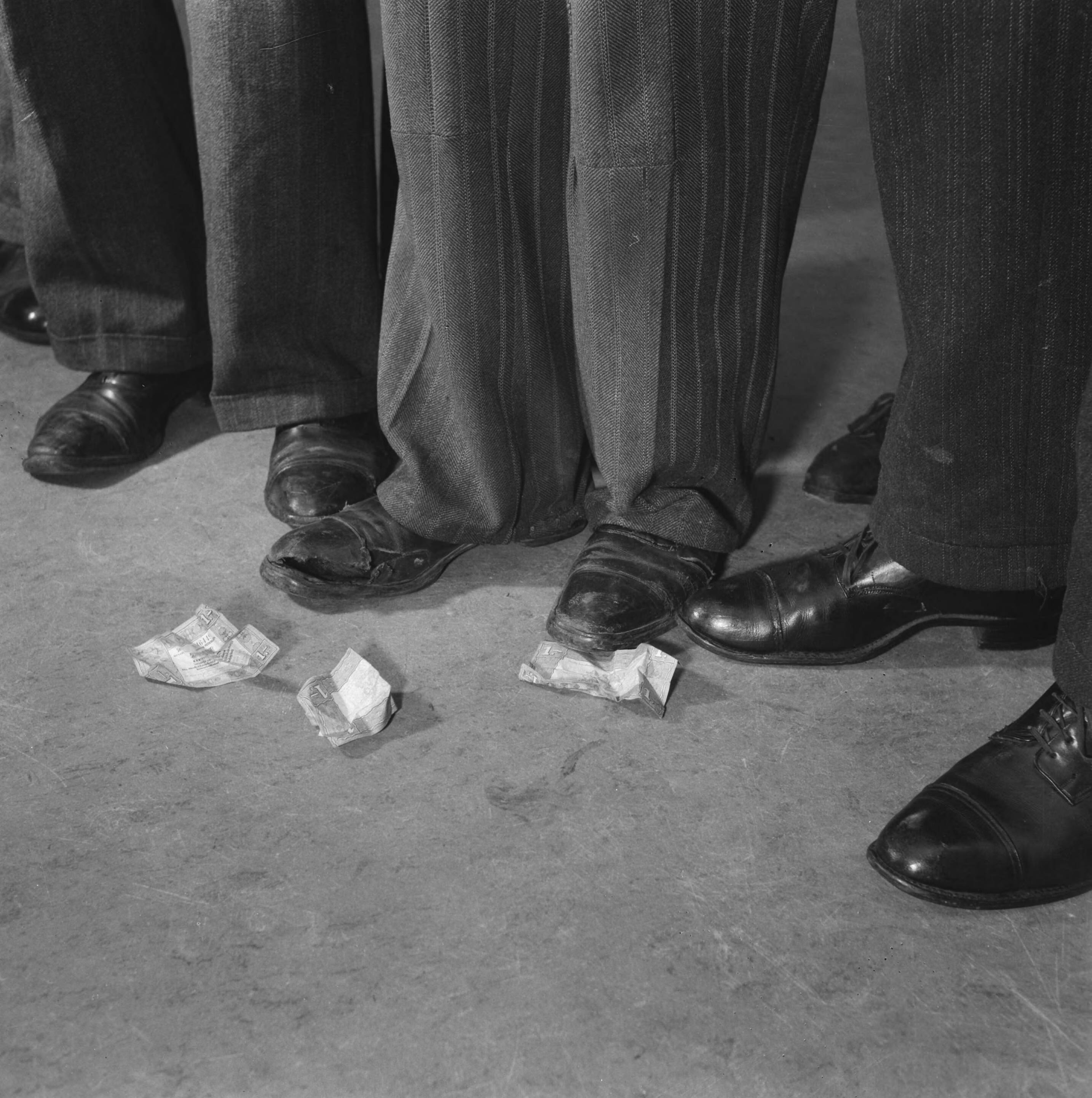 Bankbiljetten liggen verfrommeld voor de voeten van een aantal mannen
