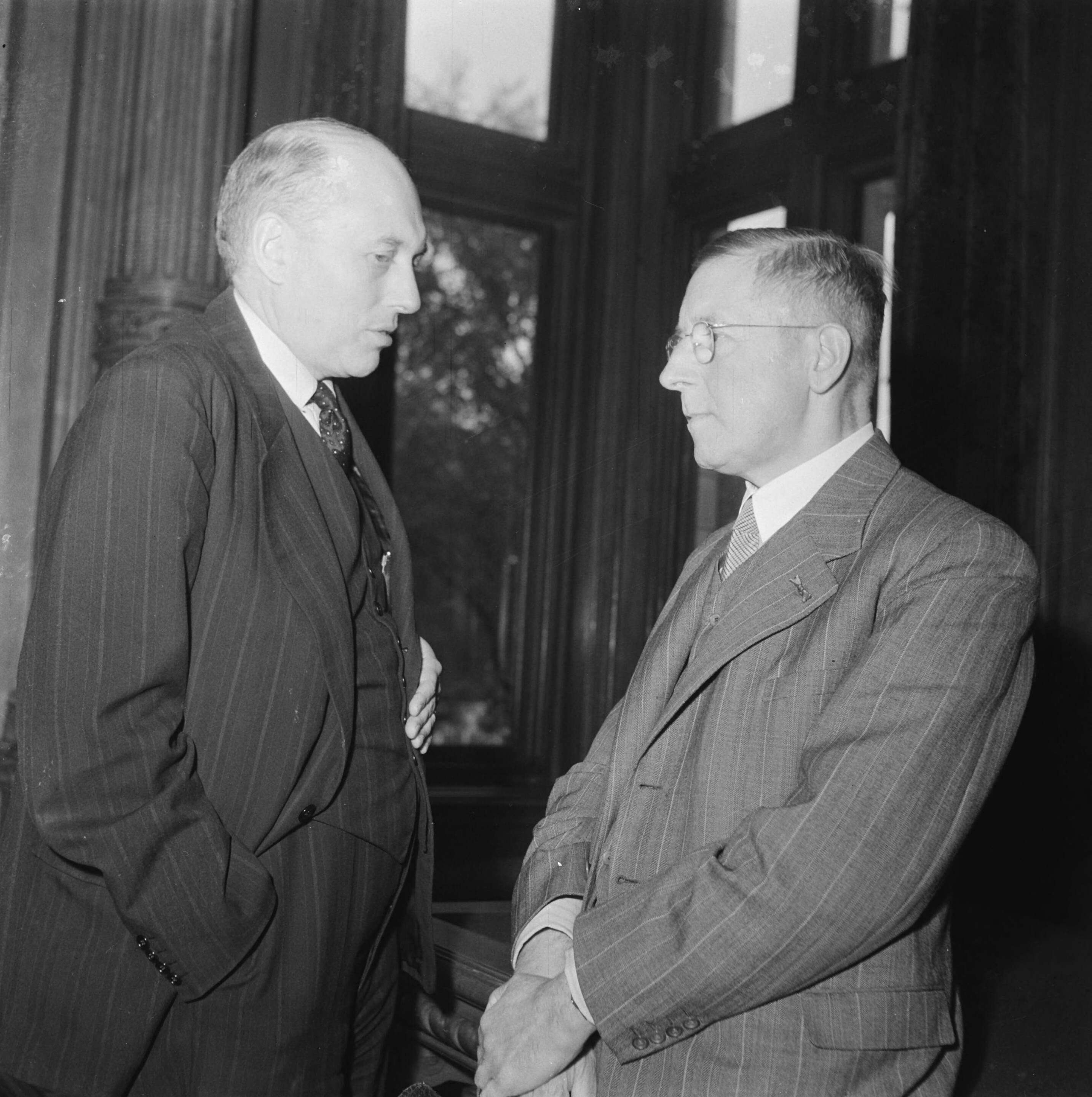 Ministerraad bijeen. Minister-president prof. ir. W. Schermerhorn (links), in gesprek met dr. J.A.