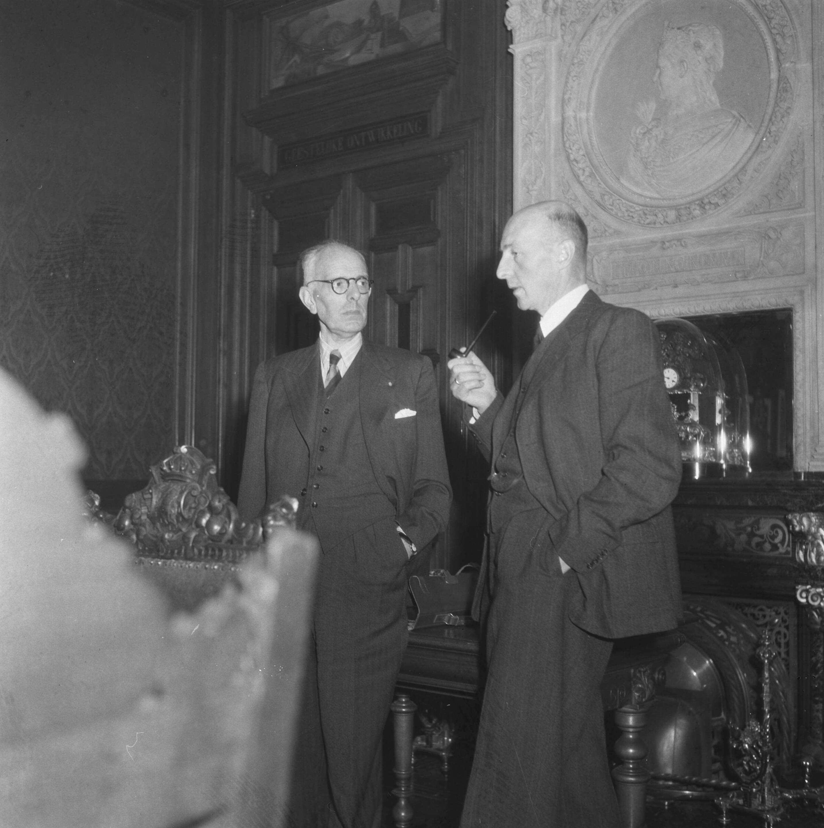 Ministerraad bijeen. Ir. Th.S.J.G.M. van Schaik (Verkeer en Energie) (links) en S.L. Mansholt (Voedselvoorziening)