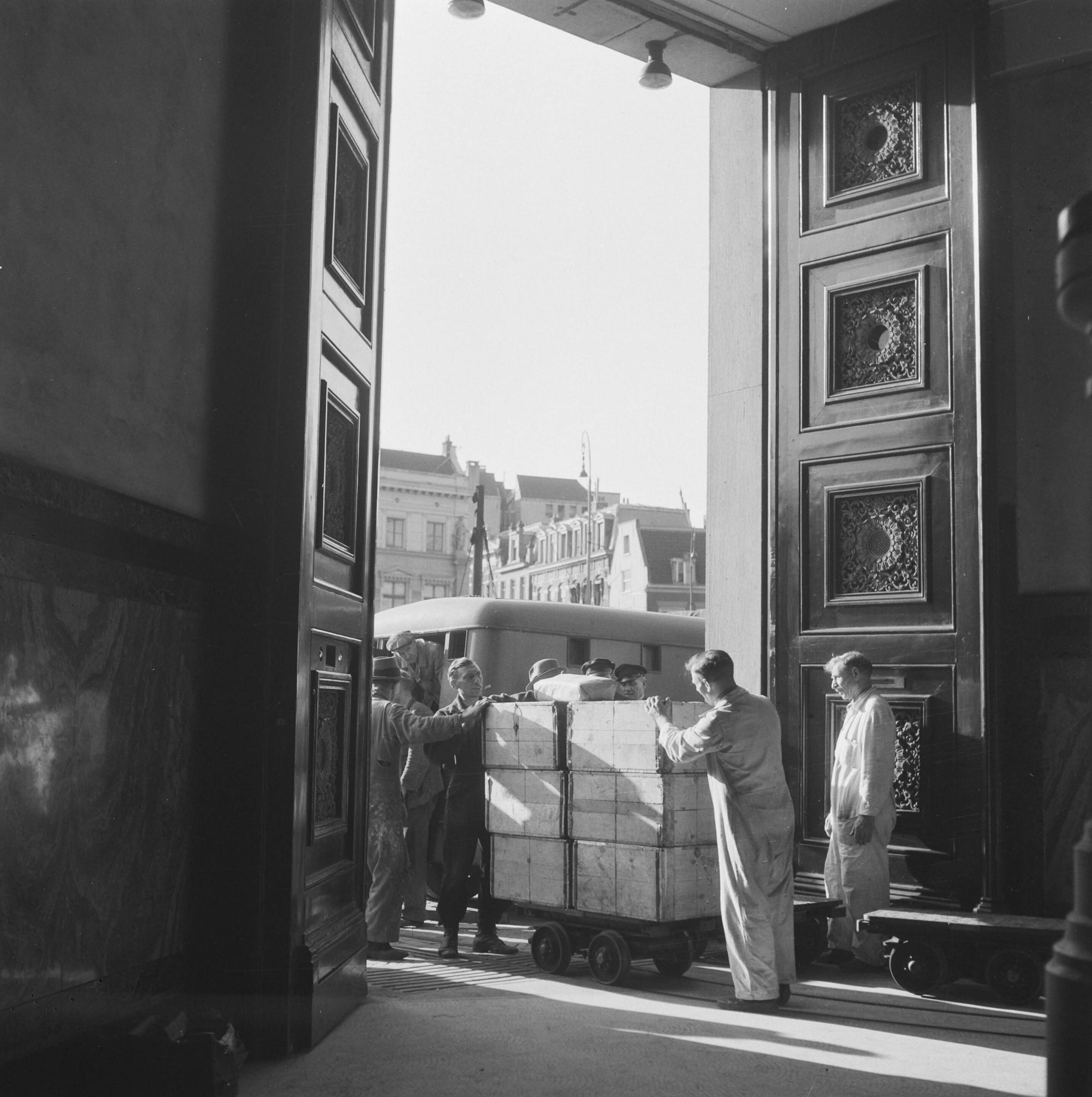 Kisten worden op lorries en smalspoor het gebouw van de Nederlandsche Bank aan de Oude Turfmarkt te Amsterdam ingereden