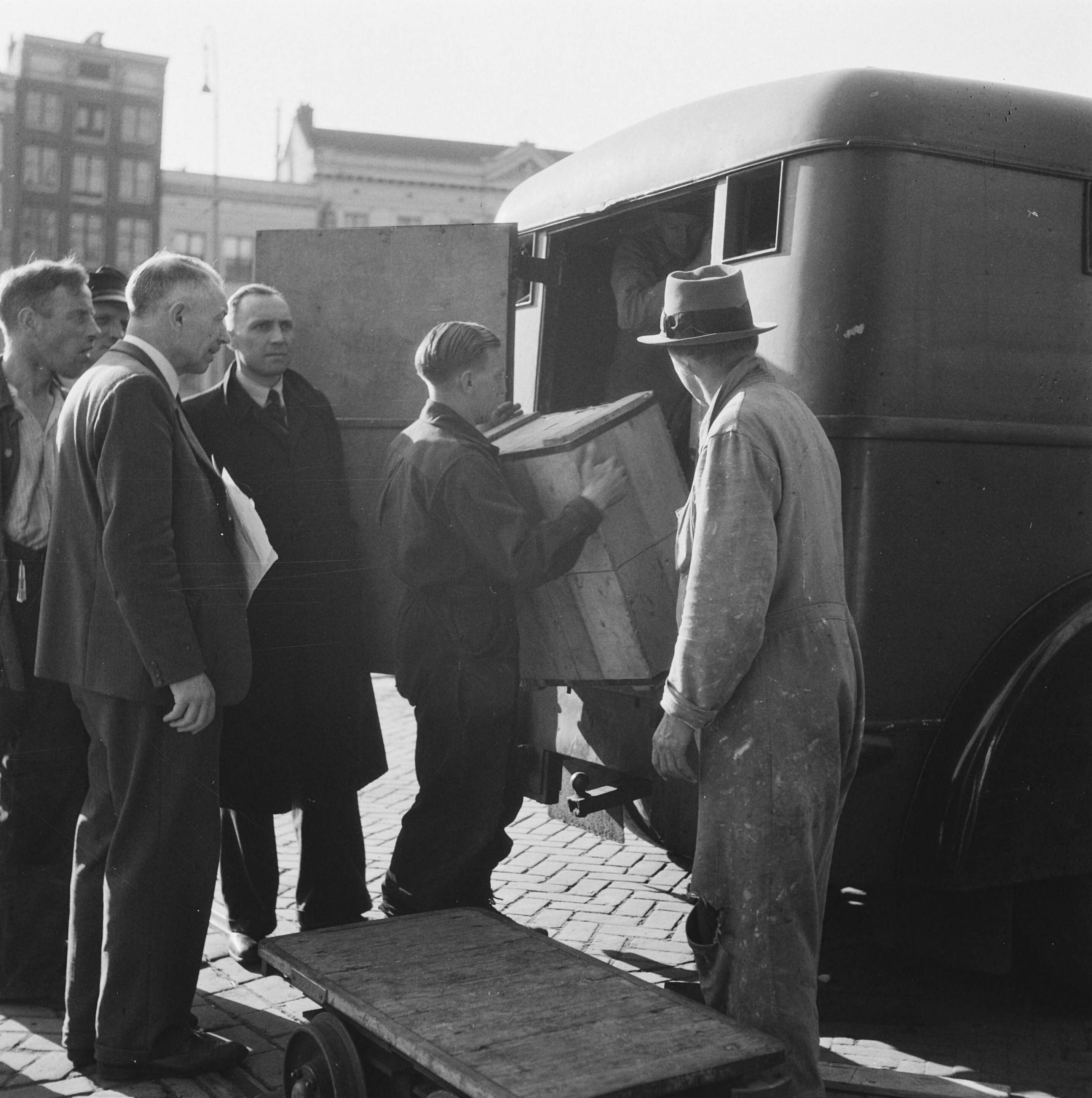 Kisten worden uit een vrachtwagen geladen bij Nederlandsche Bank aan de Oude Turfmarkt te Amsterdam