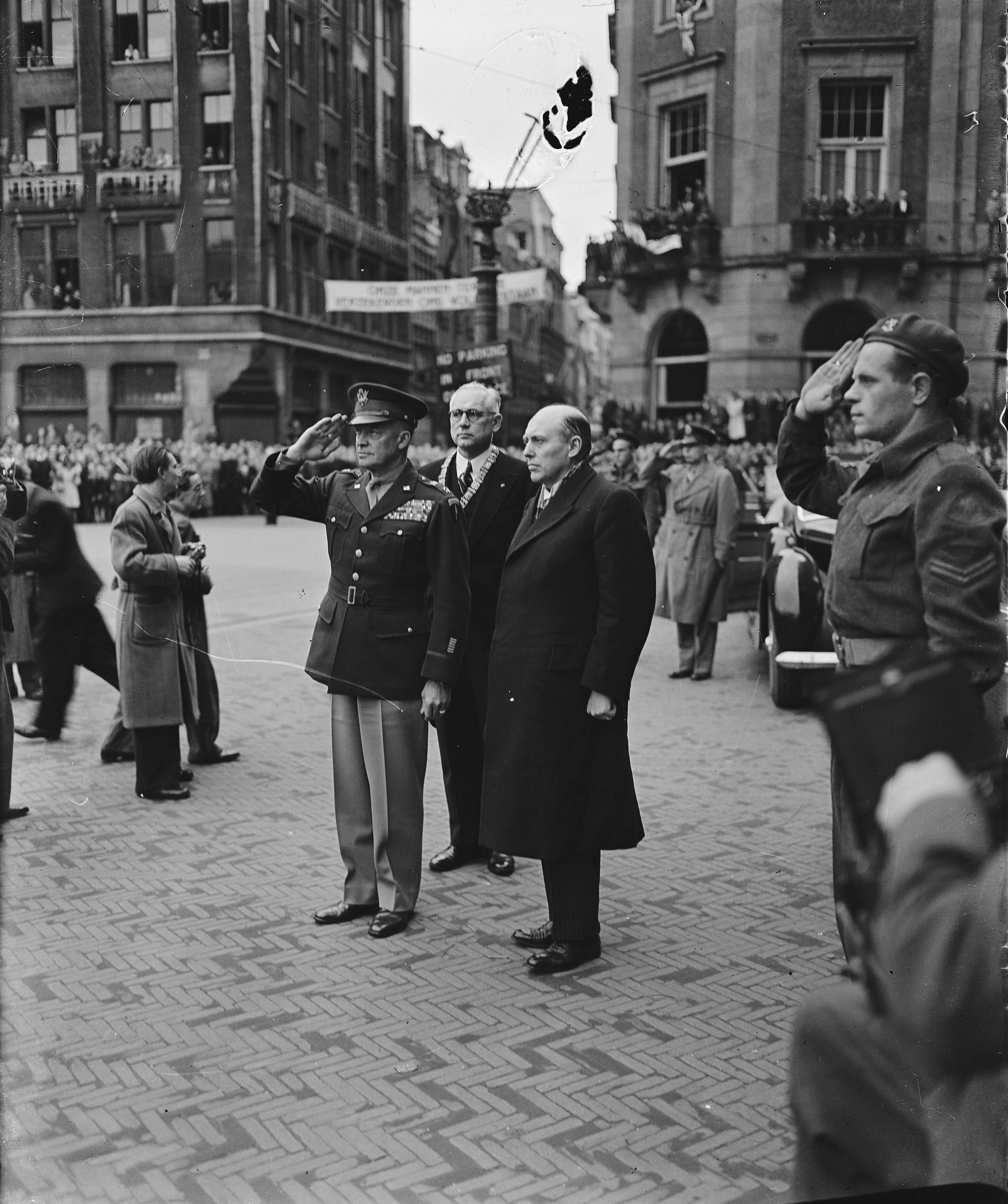 Eisenhower in Amsterdam. Eisenhower salueert op de Dam. Bij hem minister-president Schermerhorn en burgemeester Feike de Boer