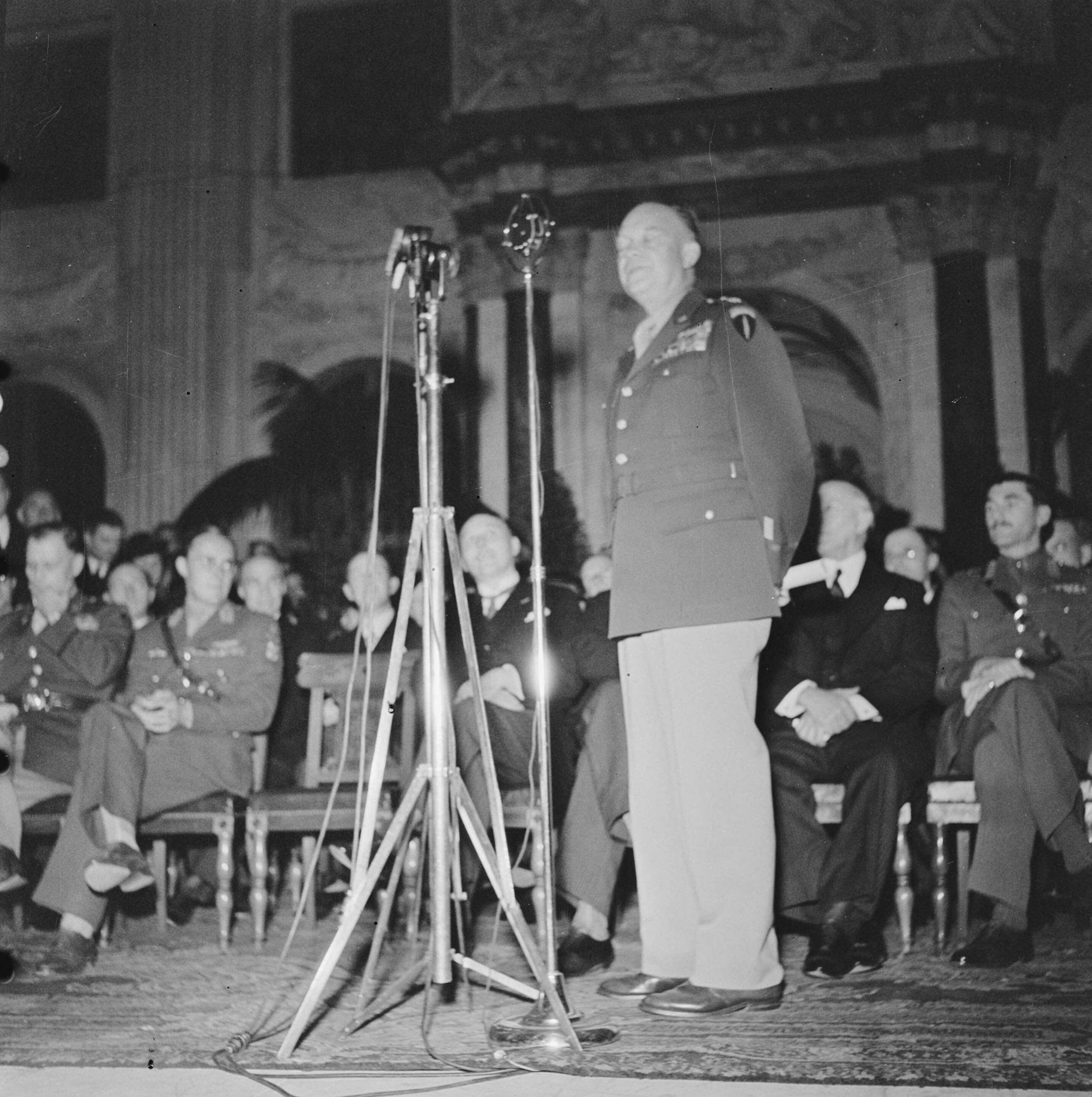 Eisenhower in Amsterdam. Burgerzaal van het Paleis op de Dam. Dankwoord van generaal Eisenhower