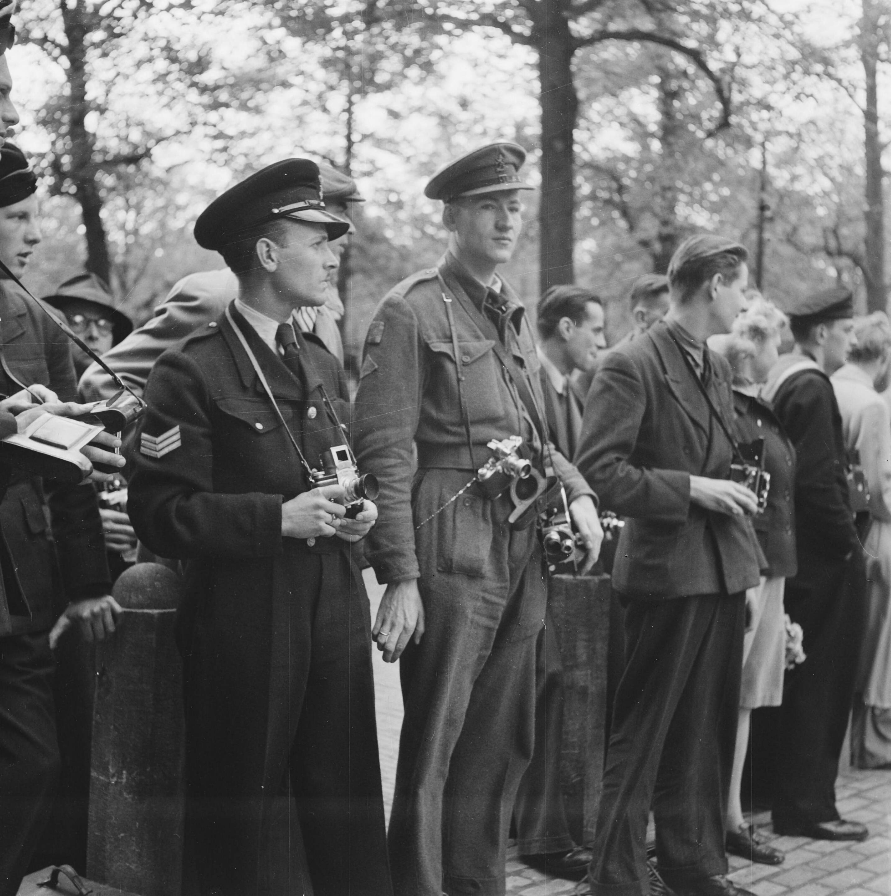 Fotografen, waarvan enkele in uniform op het Lange Voorhout