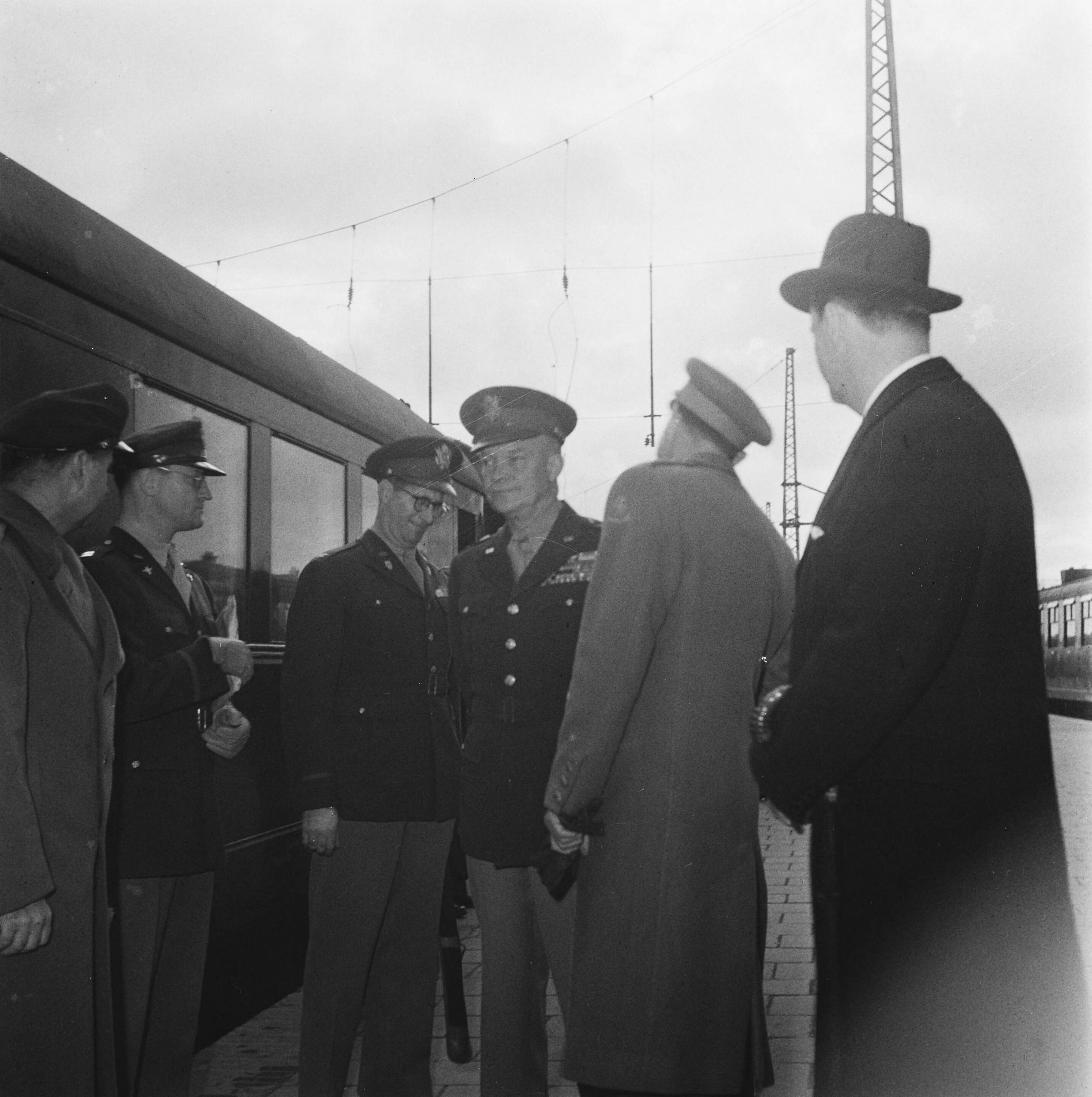 Generaal Eisenhower wordt op een station ontvangen door Prins Bernhard