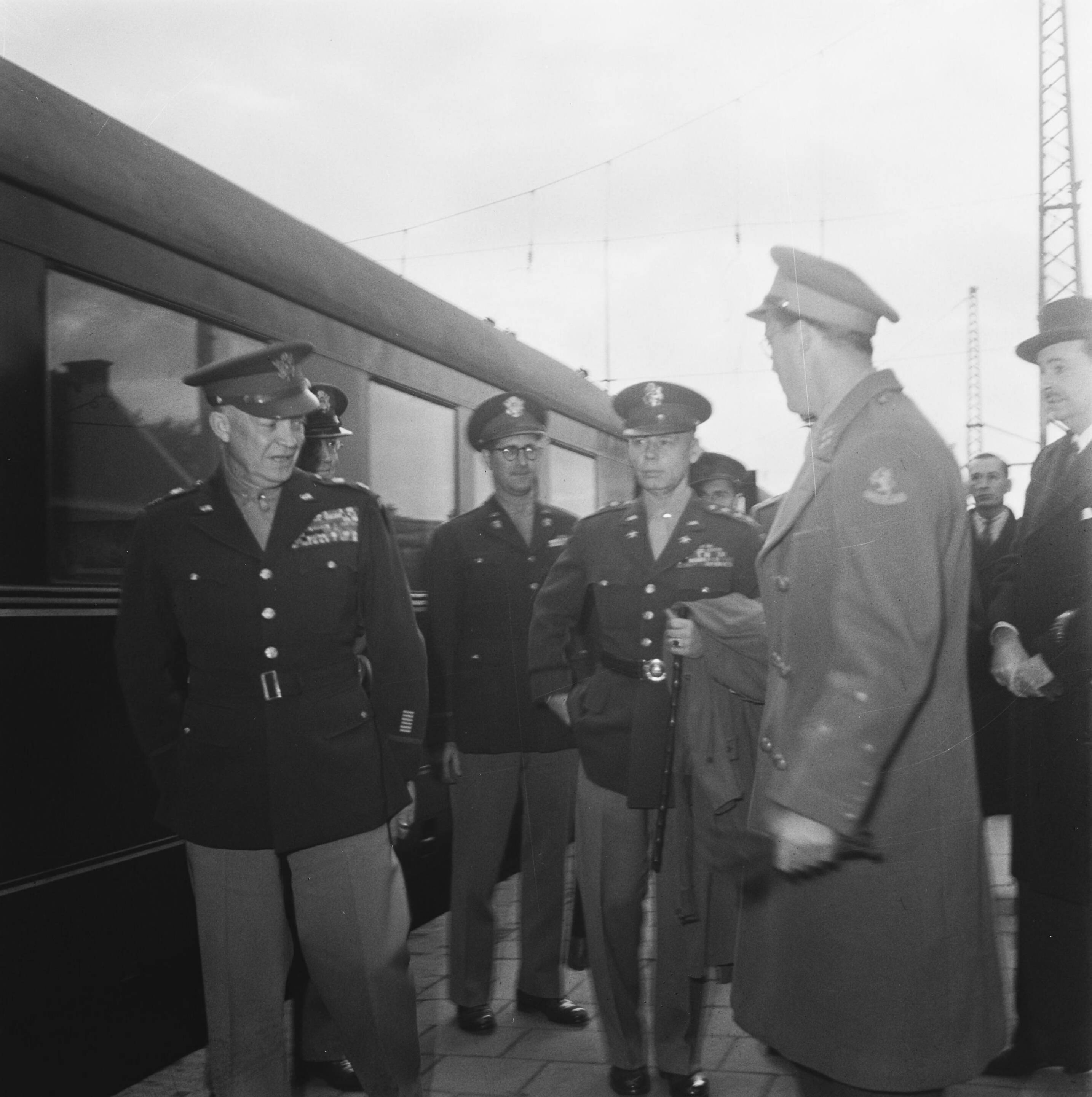 Generaal Eisenhower wordt op een station ontvangen door Prins Bernhard