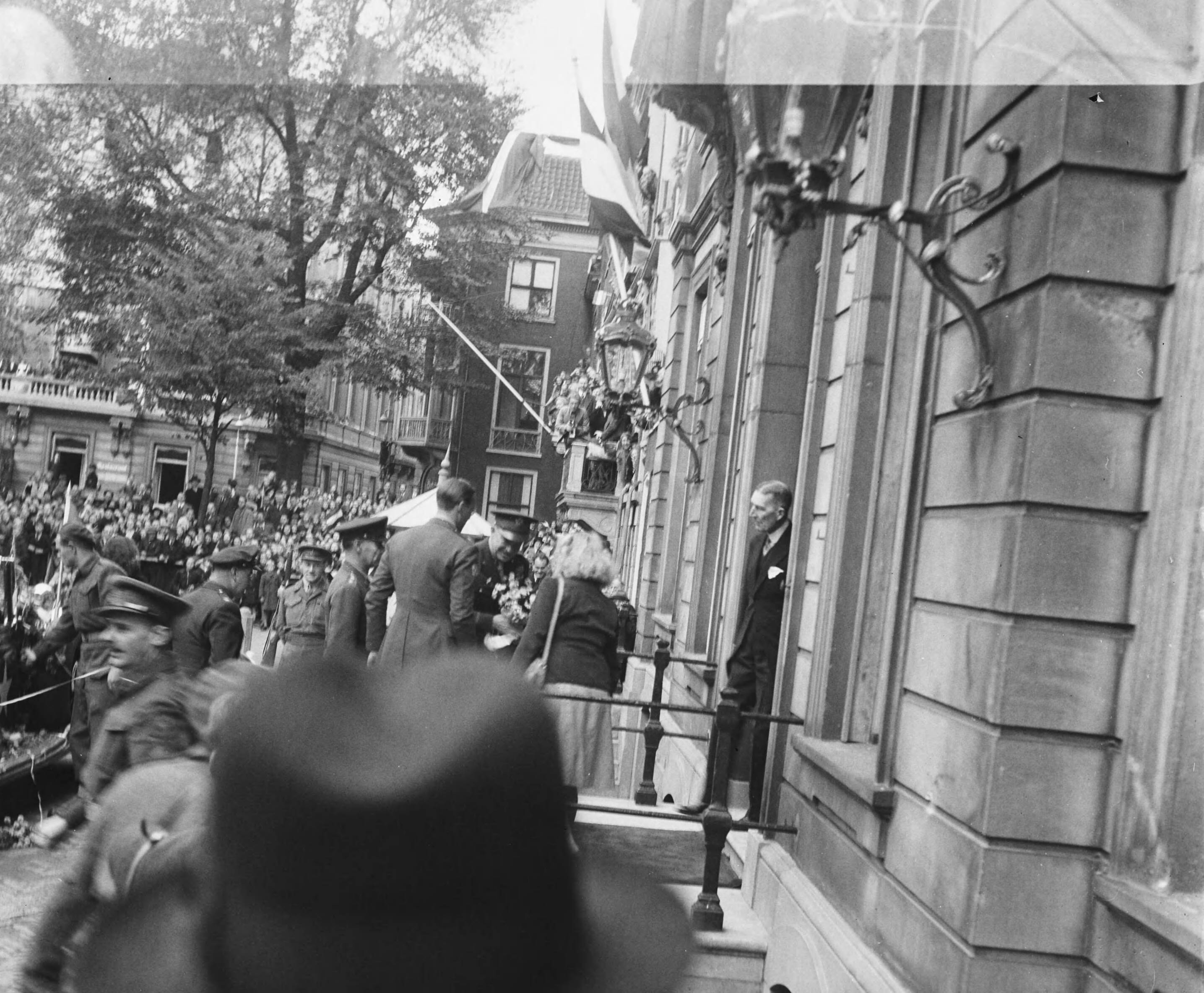 Eisenhower ontvangt bloemen bij zijn aankomst op Paleis Lange Voorhout