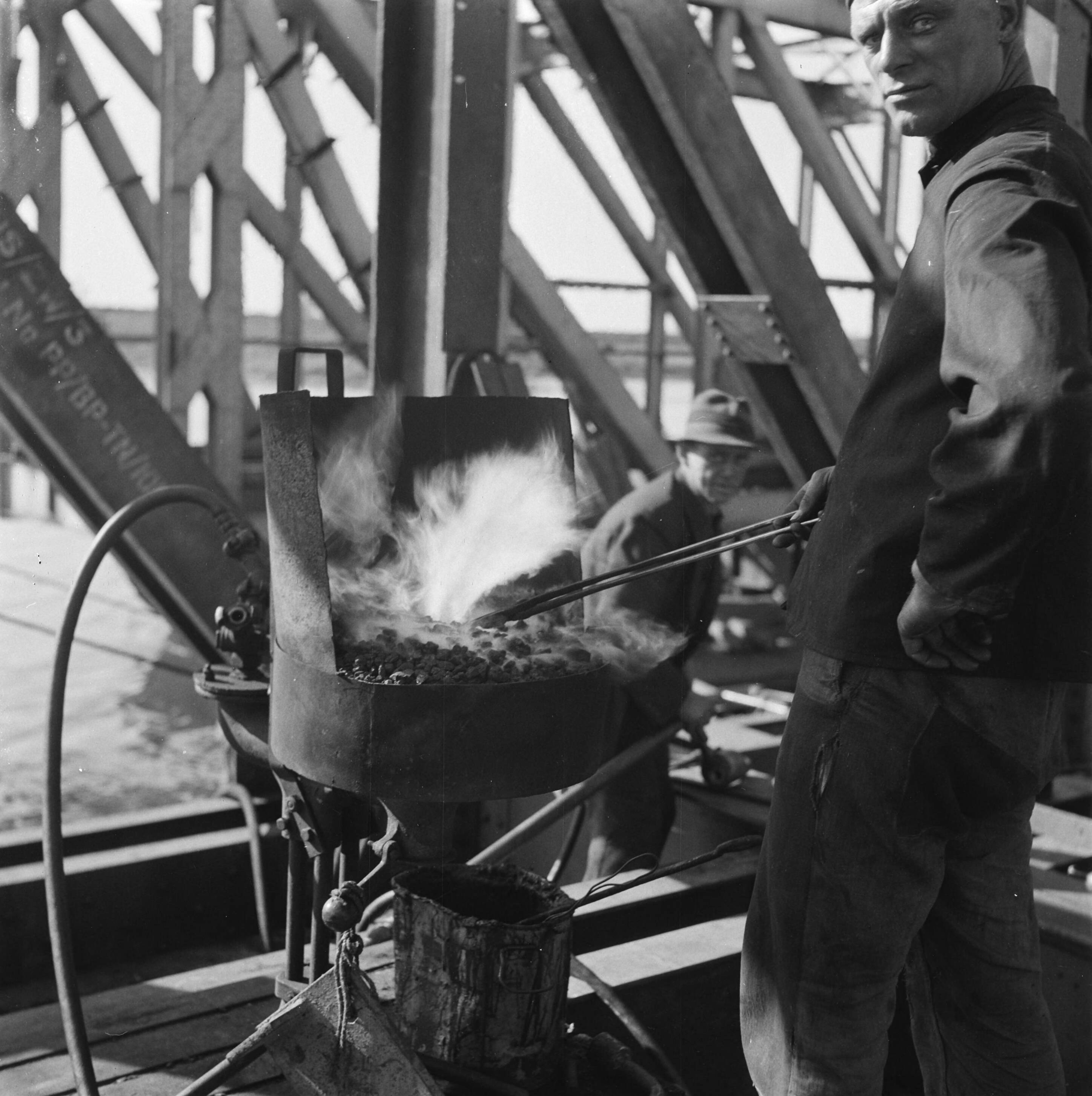 Het monteren van een brugboog van de "Waterloobridge" in de brug bij Oosterbeek