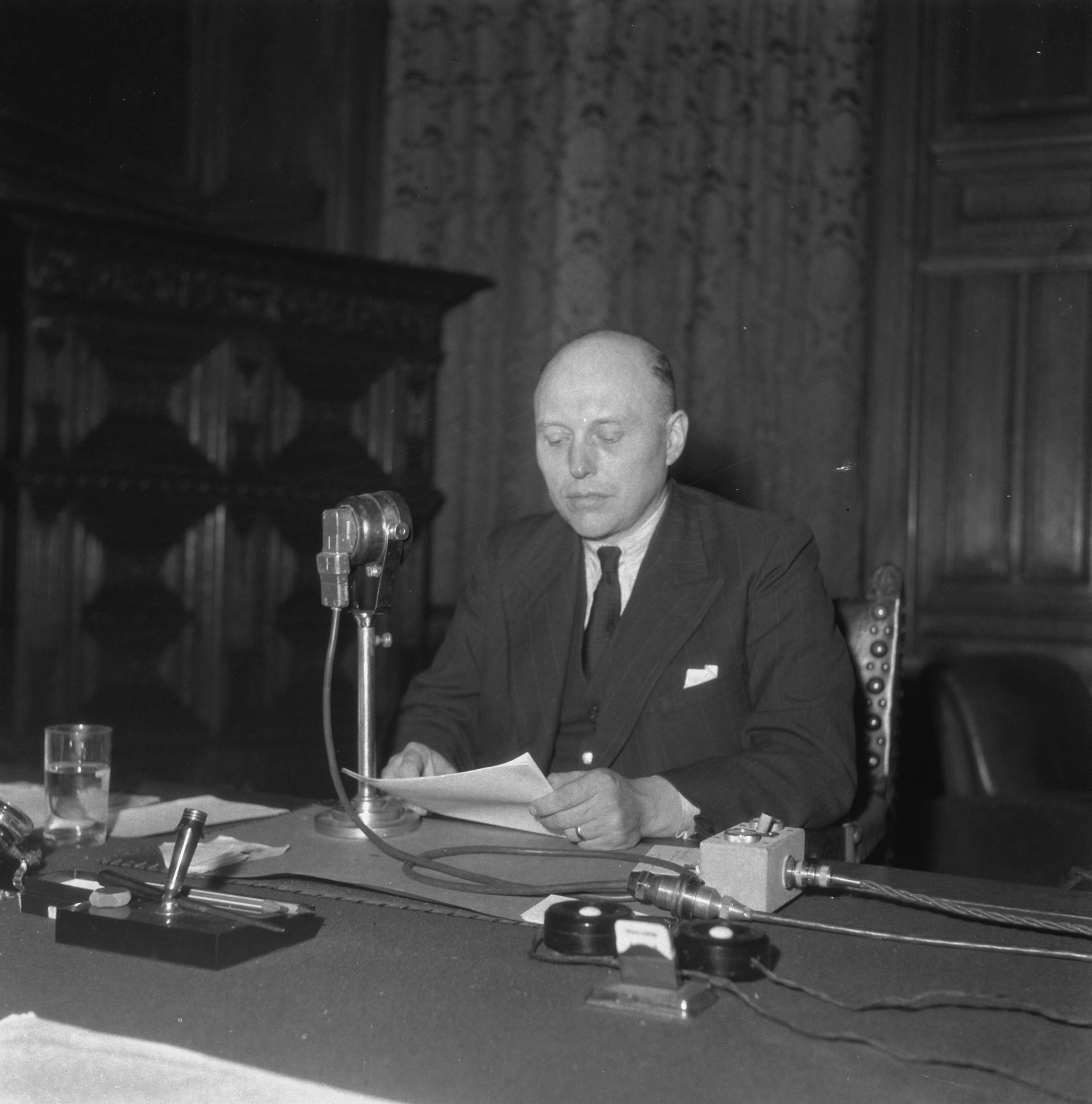 Minister-president W. Schermerhorn voor de radiomicrofoon