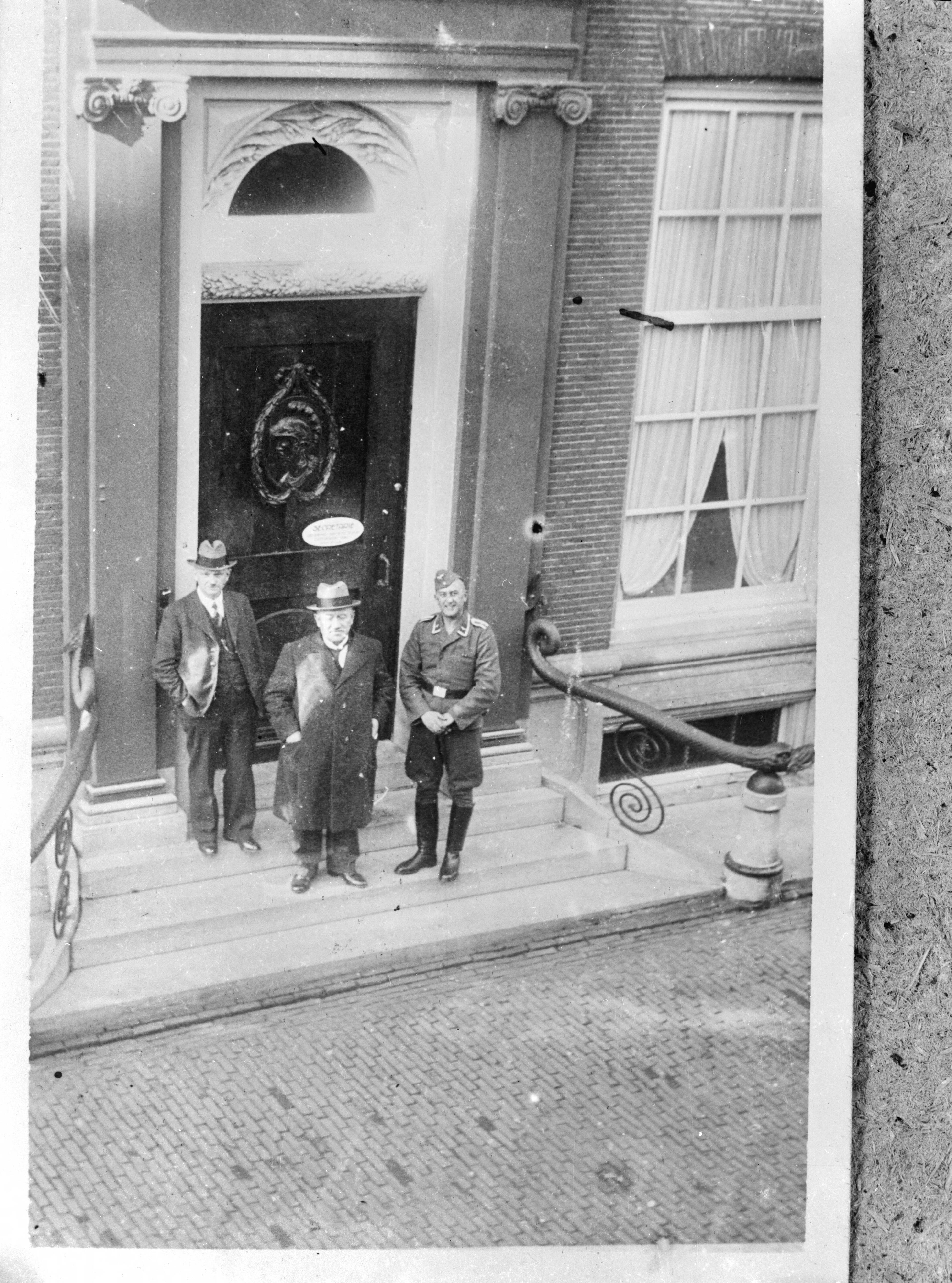 Een man in burger met aktetas poseert voor de voordeur van een gebouw. Rechts van hem een Duitse Luftwaffe militair. Links een andere man in burger. Op de deur een bord waarop te lezen is "Secretarie". Den Haag?
