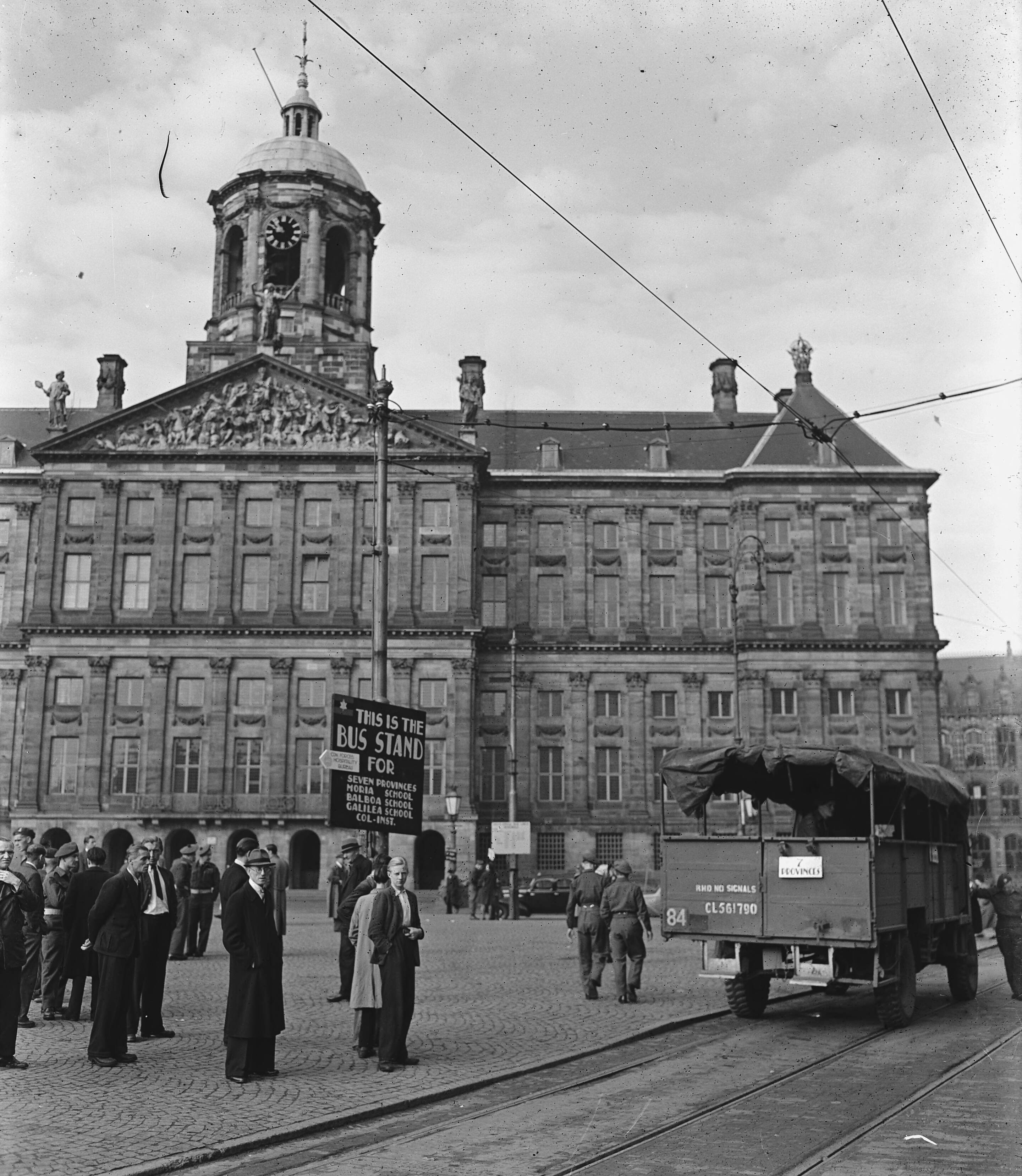 "Een wandeling door Amsterdam" De Dam met op de achtergrond het Koninklijk Paleis. Mannen staan bij een bord met opschrift "This is the Bus Stand for seven provinces Moria School, Balboa School, Galilea School, Col-Int. Een pijl wijst naar "Cdn. Forces Hospitality Bureau". Rechts een legertruck met achterop een bord met opschrift "7 Provinces"