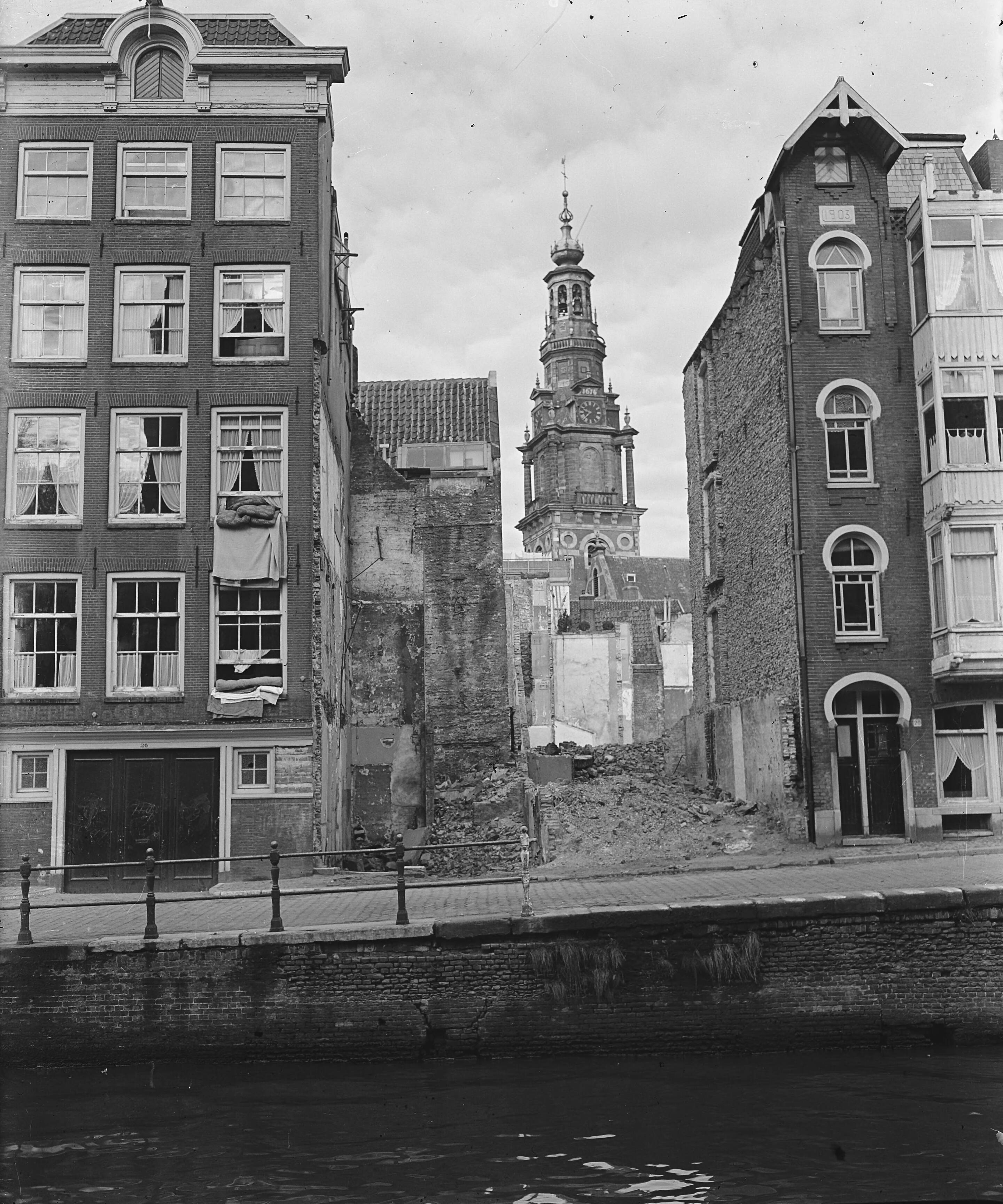 "Een wandeling door Amsterdam" Restanten van een gesloopt pand, waardoor doorzicht is naar de toren van de Zuiderkerk
