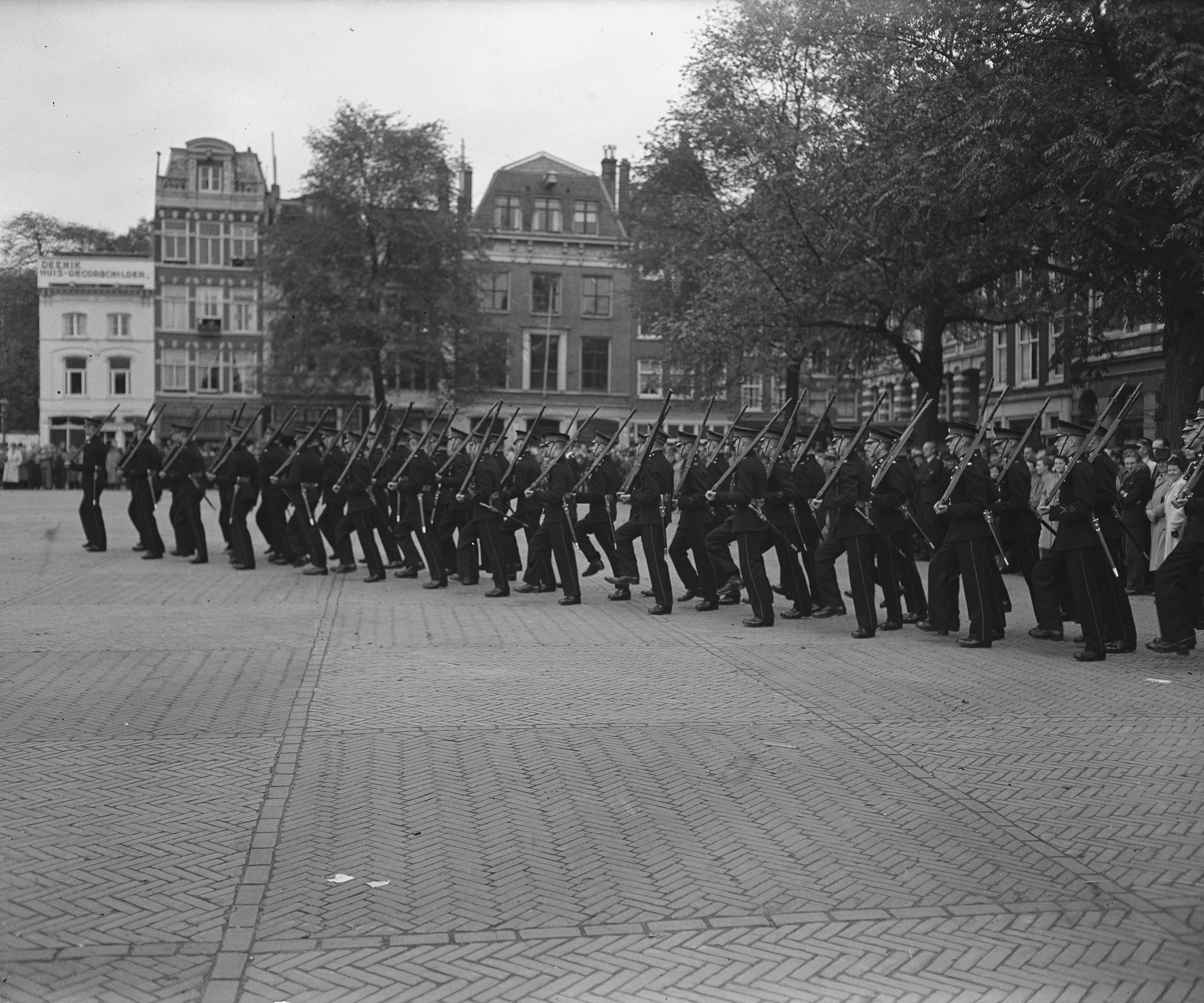 "Een wandeling door Amsterdam" Op het Amstelveld marcheert een eenheid Royal Marines