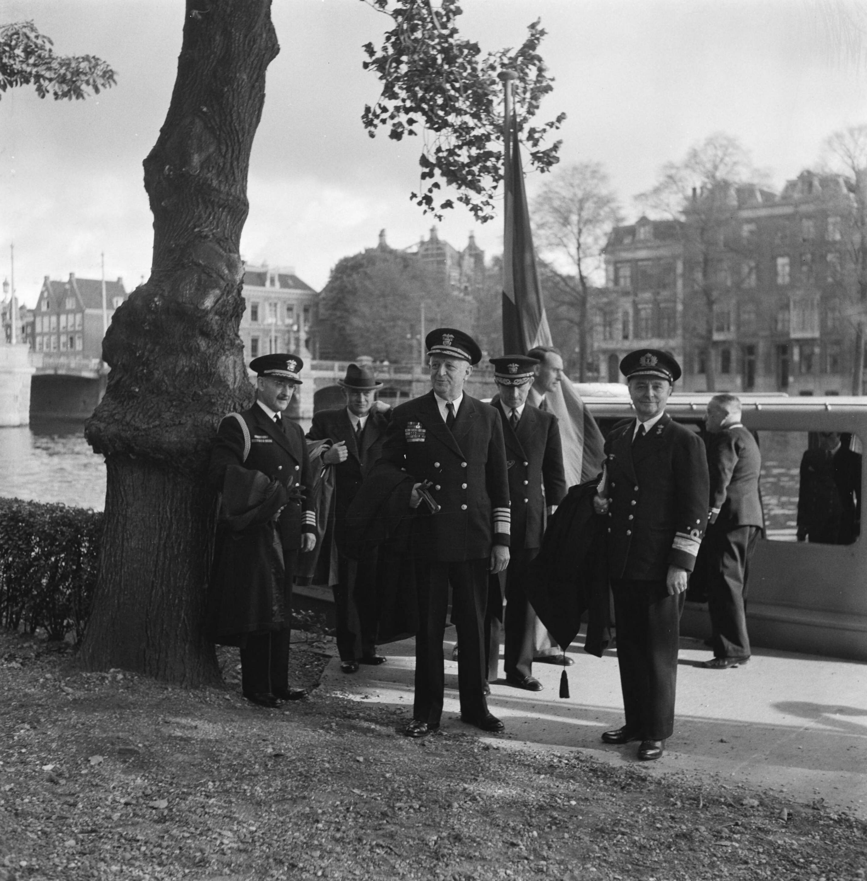 Bezoek van de Amerikaanse admiraal H. Kent Hewitt aan Nederland. Rechts op de voorgrond de commandant Zeemacht, vice-admiraal G.W. Stöve