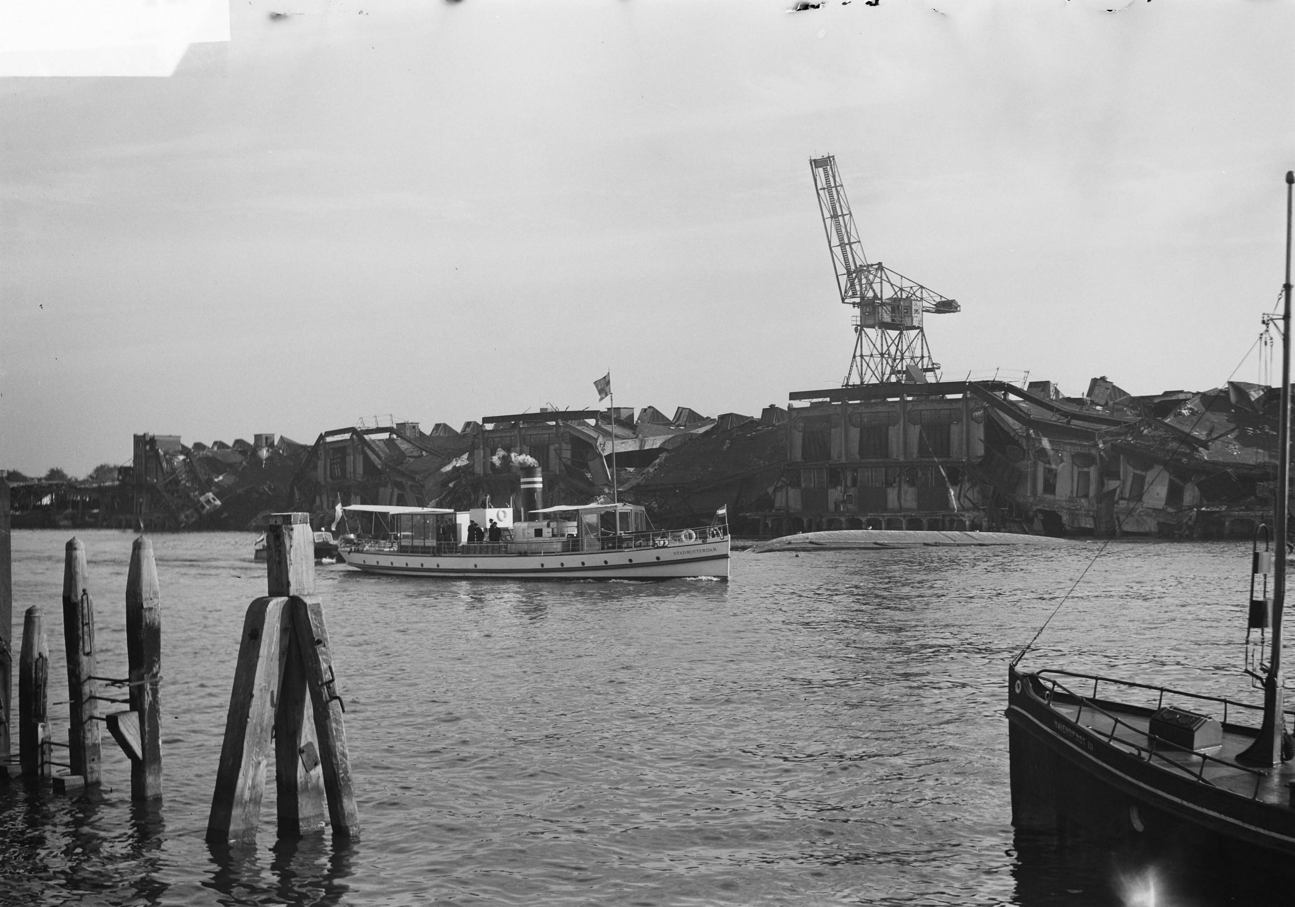 Rotterdam, reportage van de opleving in het Havenbedrijf een boot van het havenbedrijf "Stad Rotterdam" vaart langs de ruïnes van havengebouwen