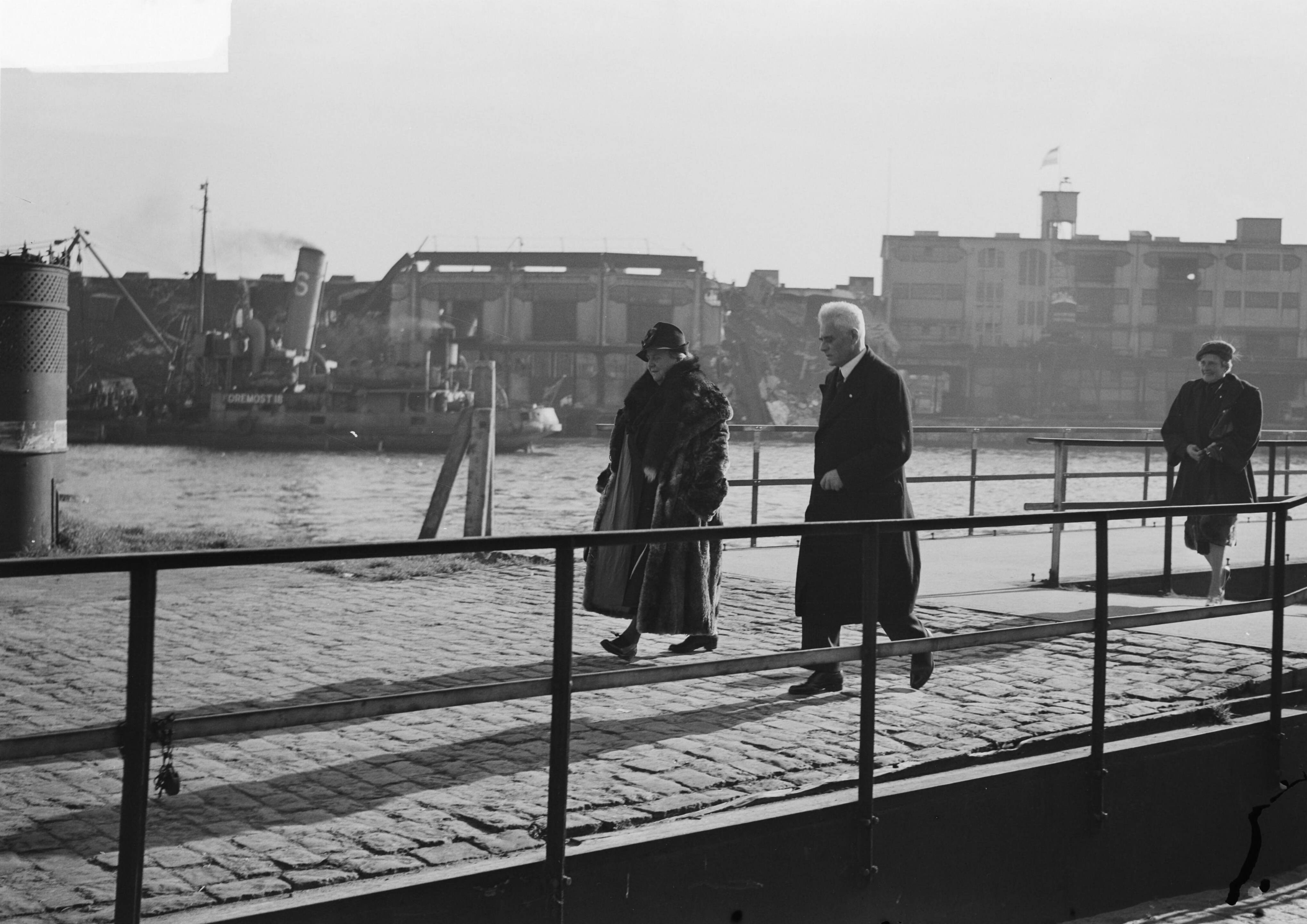 Rotterdam, reportage van de opleving in het Havenbedrijf Bezoek koningin Wilhelmina. Naast haar burgemeester P.J. Oud