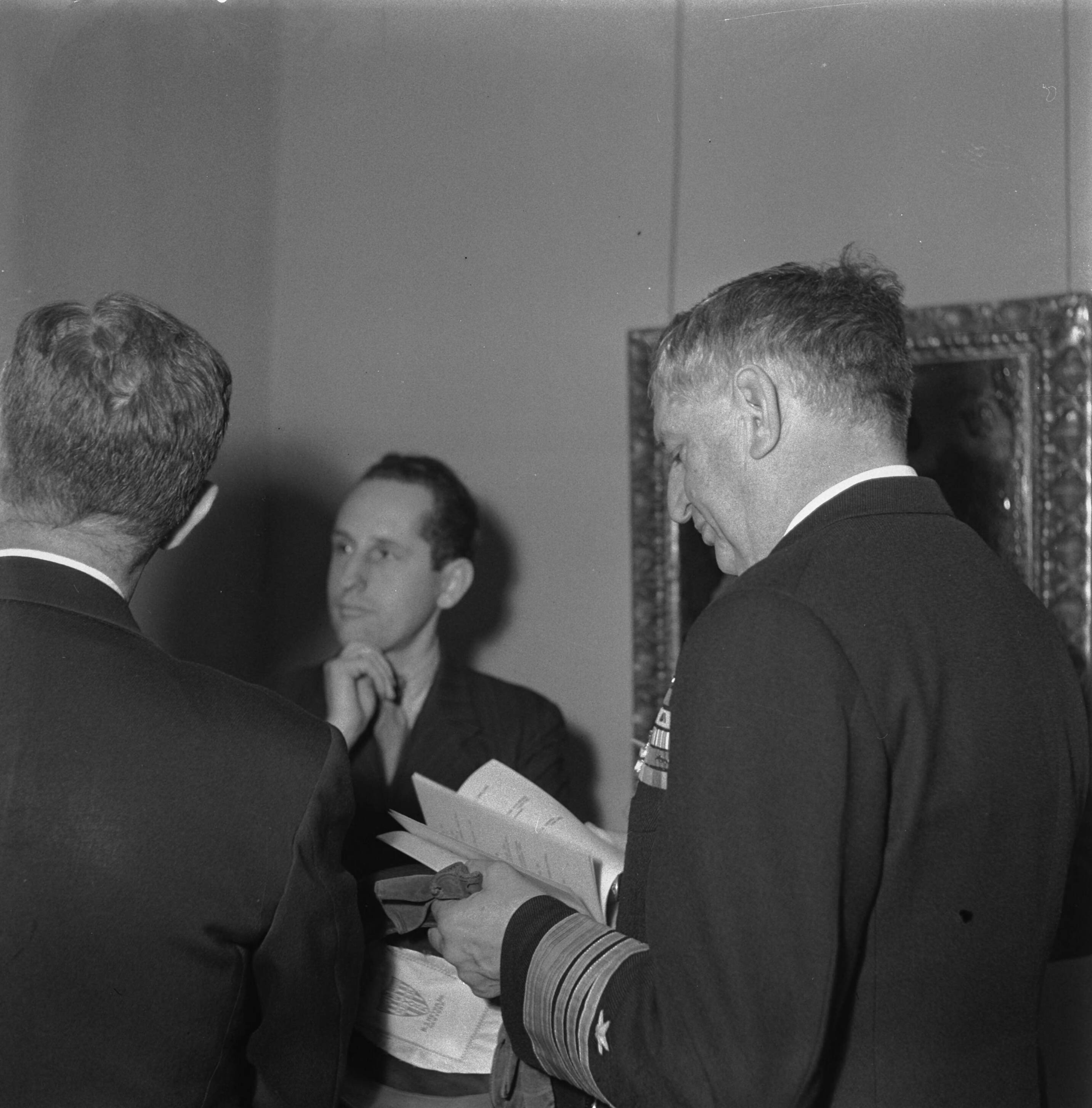 Bezoek van de Amerikaanse admiraal H. Kent Hewitt aan Nederland in een museum