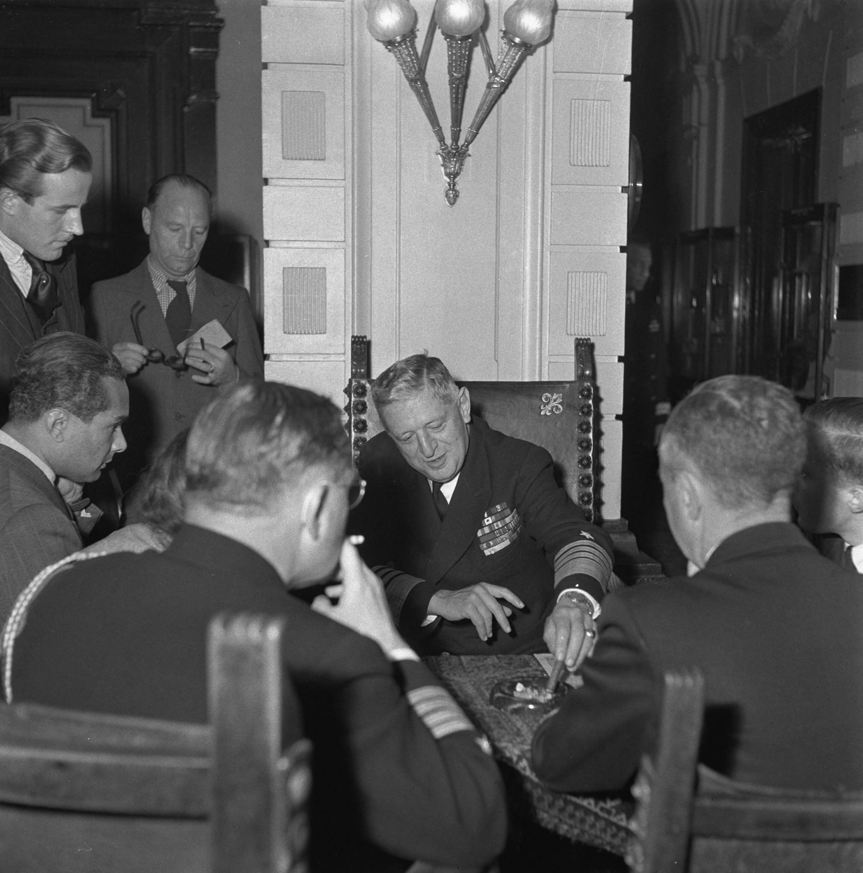 Bezoek van de Amerikaanse admiraal H. Kent Hewitt aan Nederland In gesprek met journalisten in het Amstel Hotel