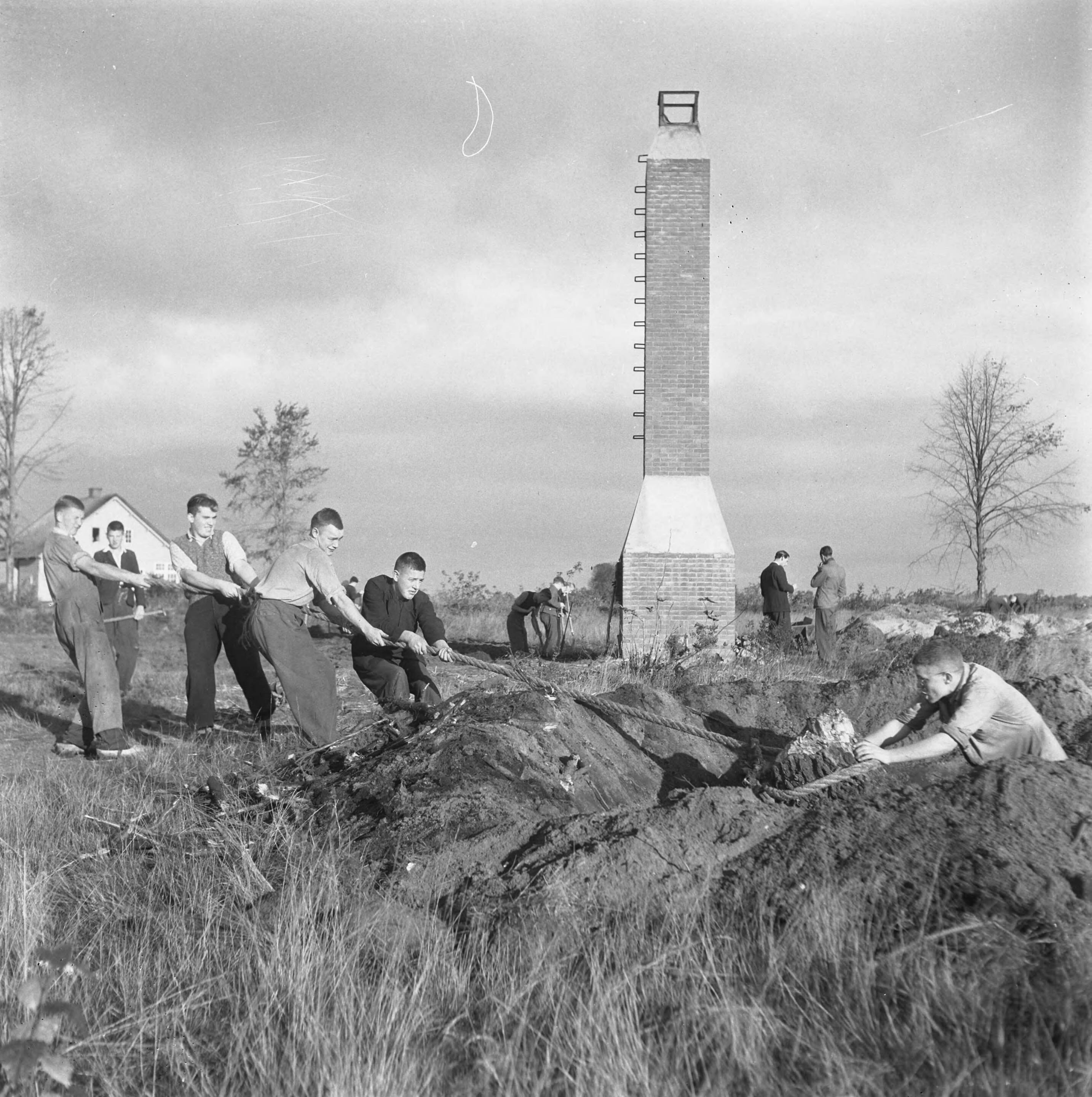 Jongens bezig met rooien van boomstronken. Op de achtergrond een schoorsteen