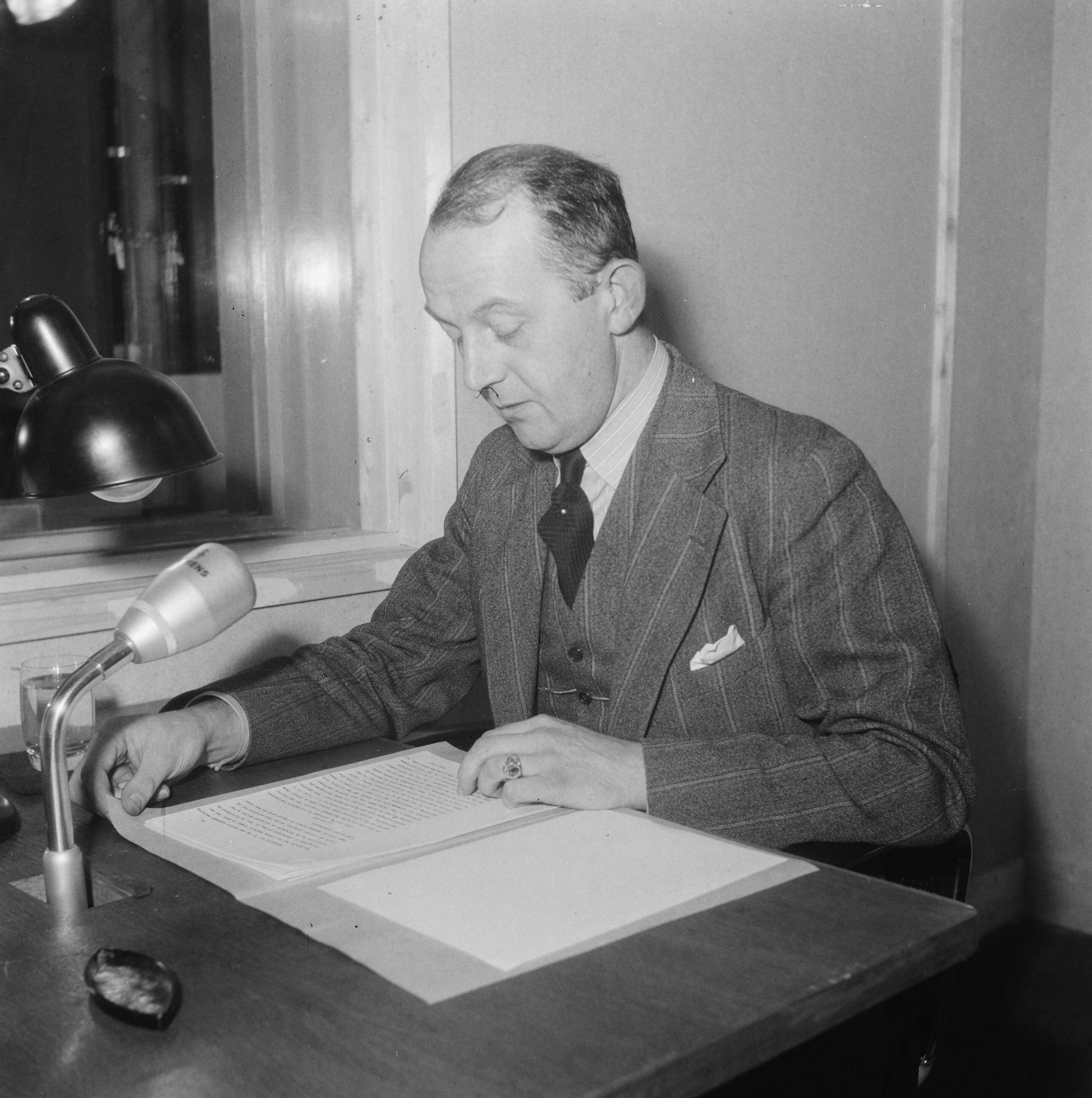 Minister van Justitie H.M.A.T. Kolfschoten in een radiostudio tijdens een radiorede