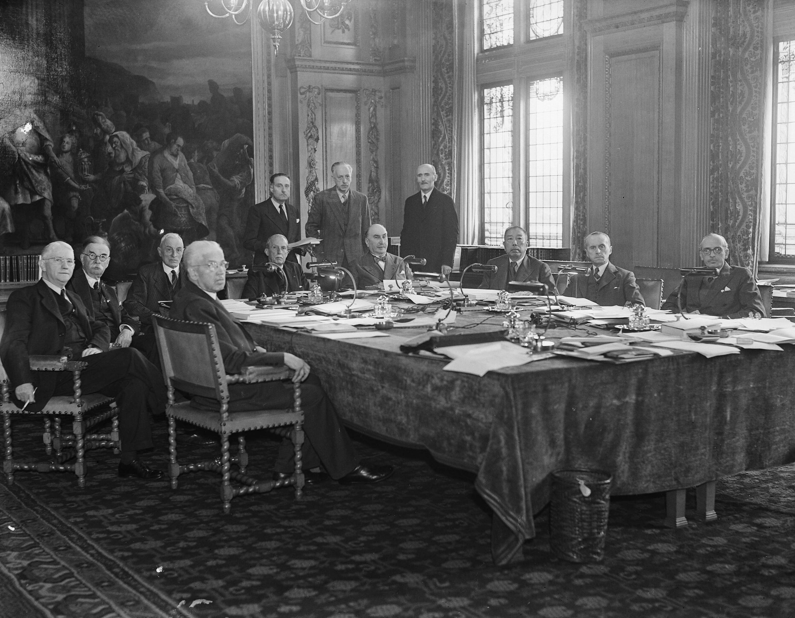 Het Permanente Hof van Internationale Justitie bijeen. Laatste sessie voor de opheffing onder leiding van president Guerrero. Vlnr. Hudson (USA), Jhr W. van Eysinga (Holland) Sir Cecil Hurst (Engeland), Erich (Finland), Guerrero (San Salvador, president), Negulesco (Roemenie, ), Cheng (China), de Visser ( Belgie), Olivan (Spanje) leden van het Internationaal Hof voor Justitie. Staande de drie secretarissen.