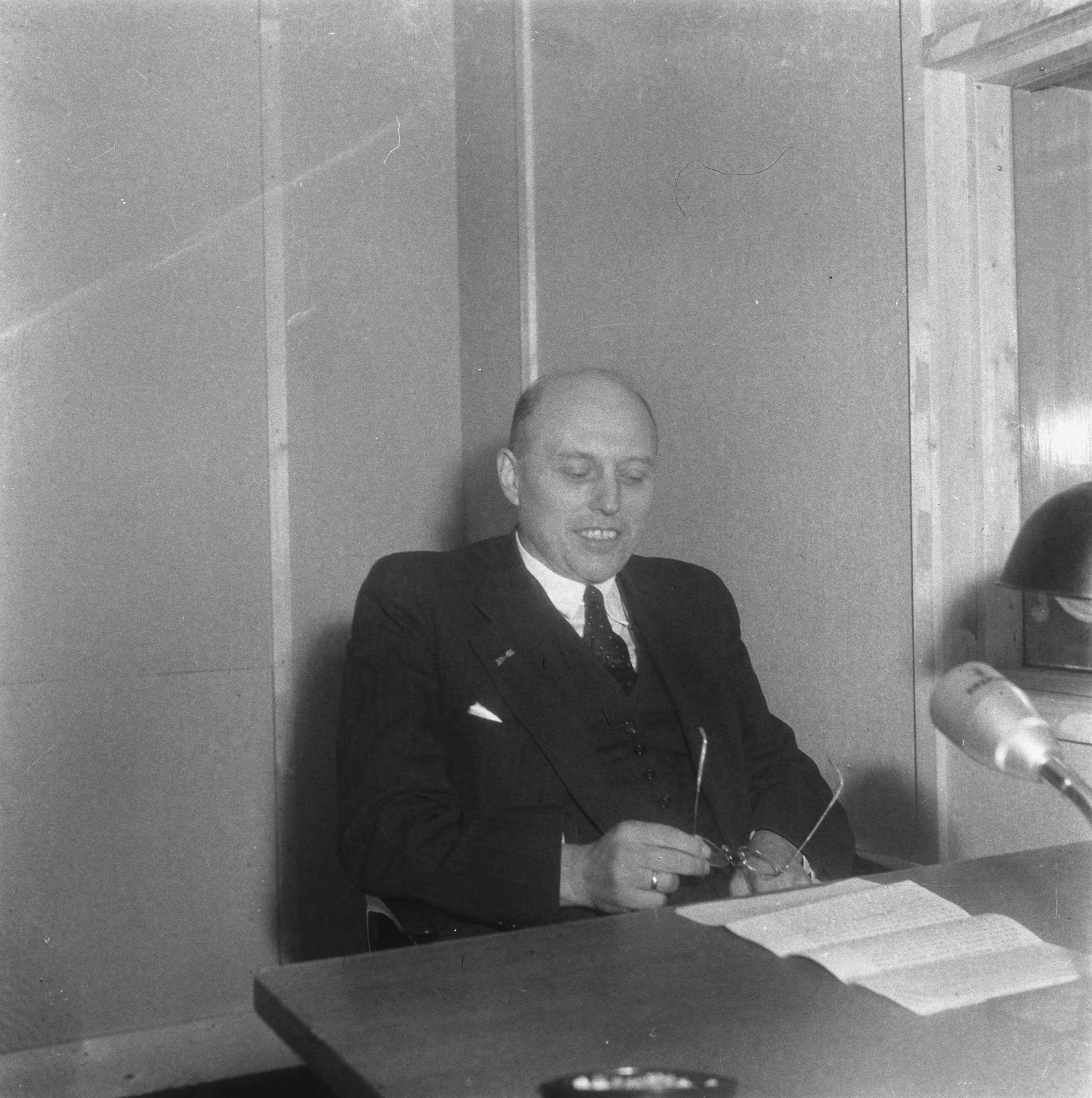 Minister-president Schermerhorn voor de radio-microfoon