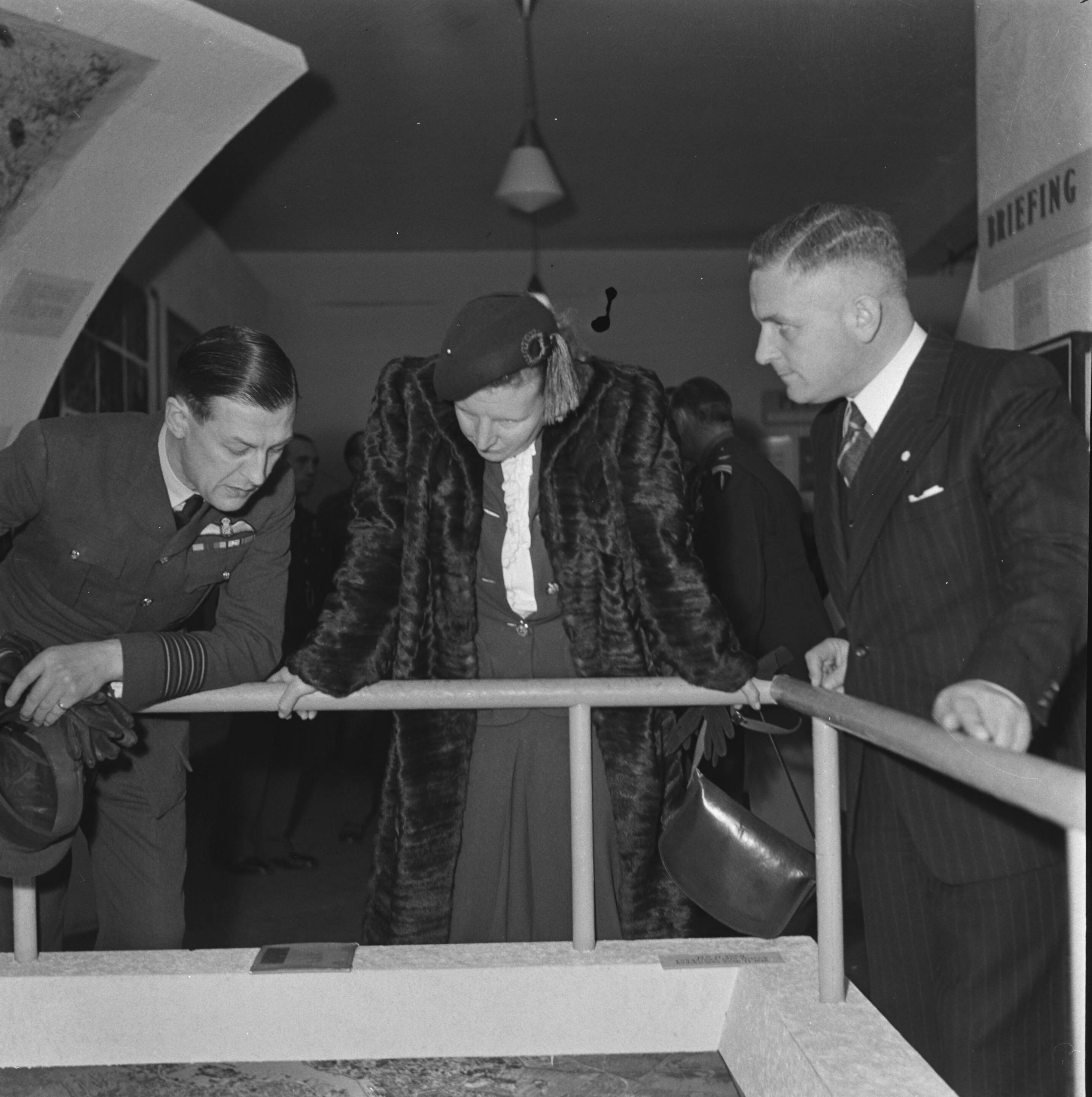 Openingsplechtigheid van de gemeenschappelijke R.A.F. — U.S.A.A.F-tentoonstelling in de Bijenkorf te Den Haag. Rondgang. In het midden Prinses Juliana. Links air chief marshal sir Sholto Douglas. Recht baron G.D.C. van Hardenbroek, die namens koningin Wilhelmina de tentoonstelling opende