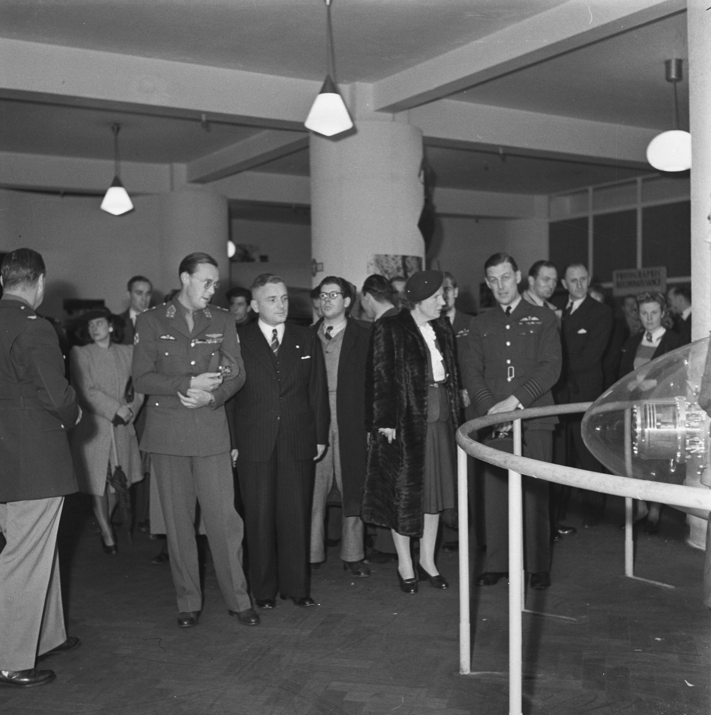 Openingsplechtigheid van de gemeenschappelijke R.A.F. — U.S.A.A.F-tentoonstelling in de Bijenkorf te Den Haag. Rondgang van prins Bernhard met prinses Juliana
