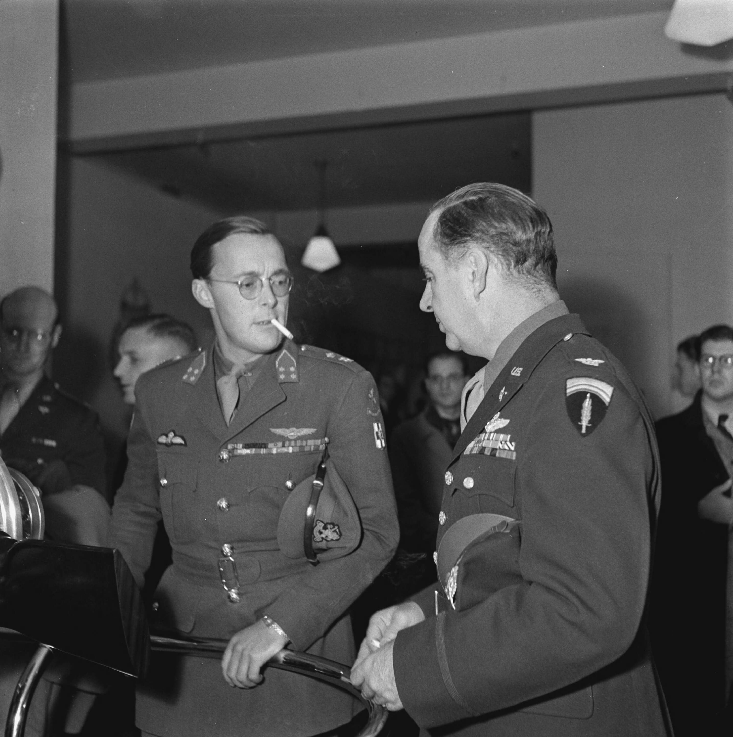 Openingsplechtigheid van de gemeenschappelijke R.A.F. — U.S.A.A.F-tentoonstelling in de Bijenkorf te Den Haag. Prins Bernhard met de Amerikaanse luitenant-generaal John K. Cannon
