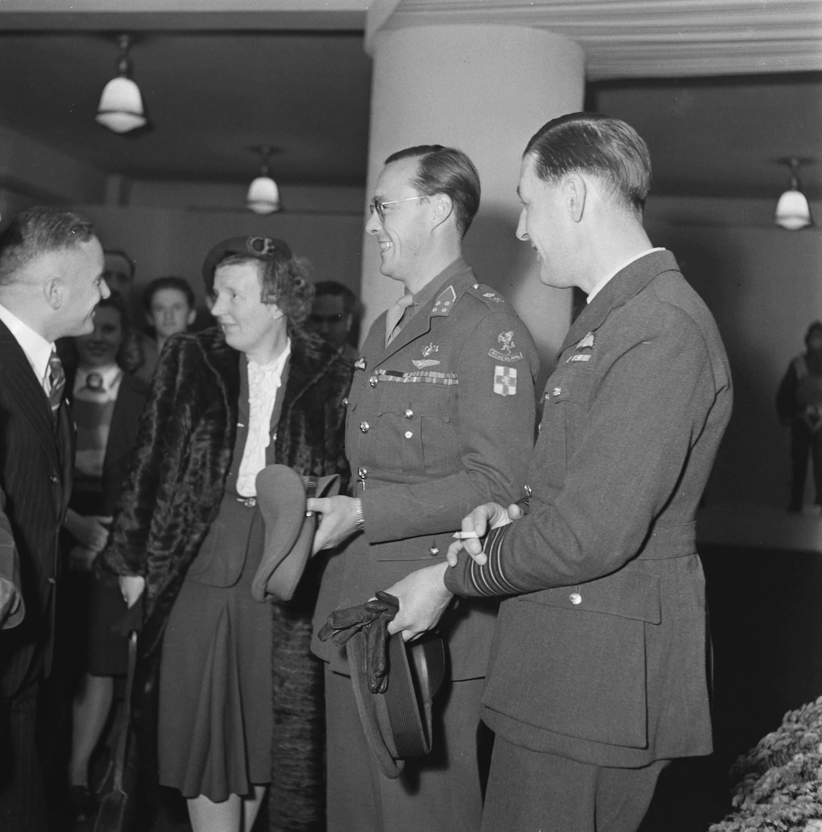 Openingsplechtigheid van de gemeenschappelijke R.A.F. — U.S.A.A.F-tentoonstelling in de Bijenkorf te Den Haag.