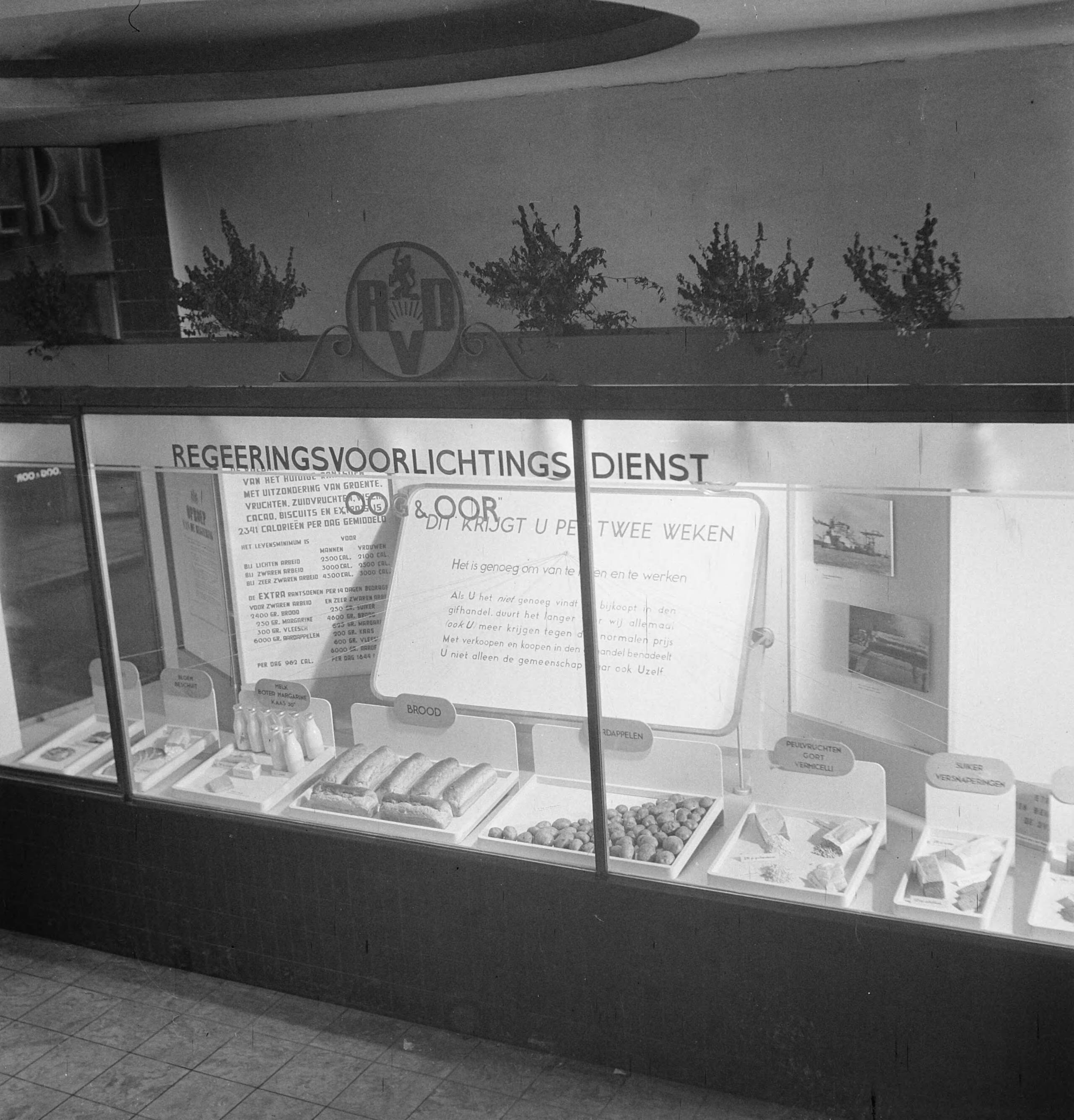 Vitrine van de Regeeringsvoorlichtingsdienst "Oog & Oor" met een uitstalling van levensmiddelen voor een periode van twee weken i.v.m. voedseldistributie met waarschuwing tegen zwarte handel