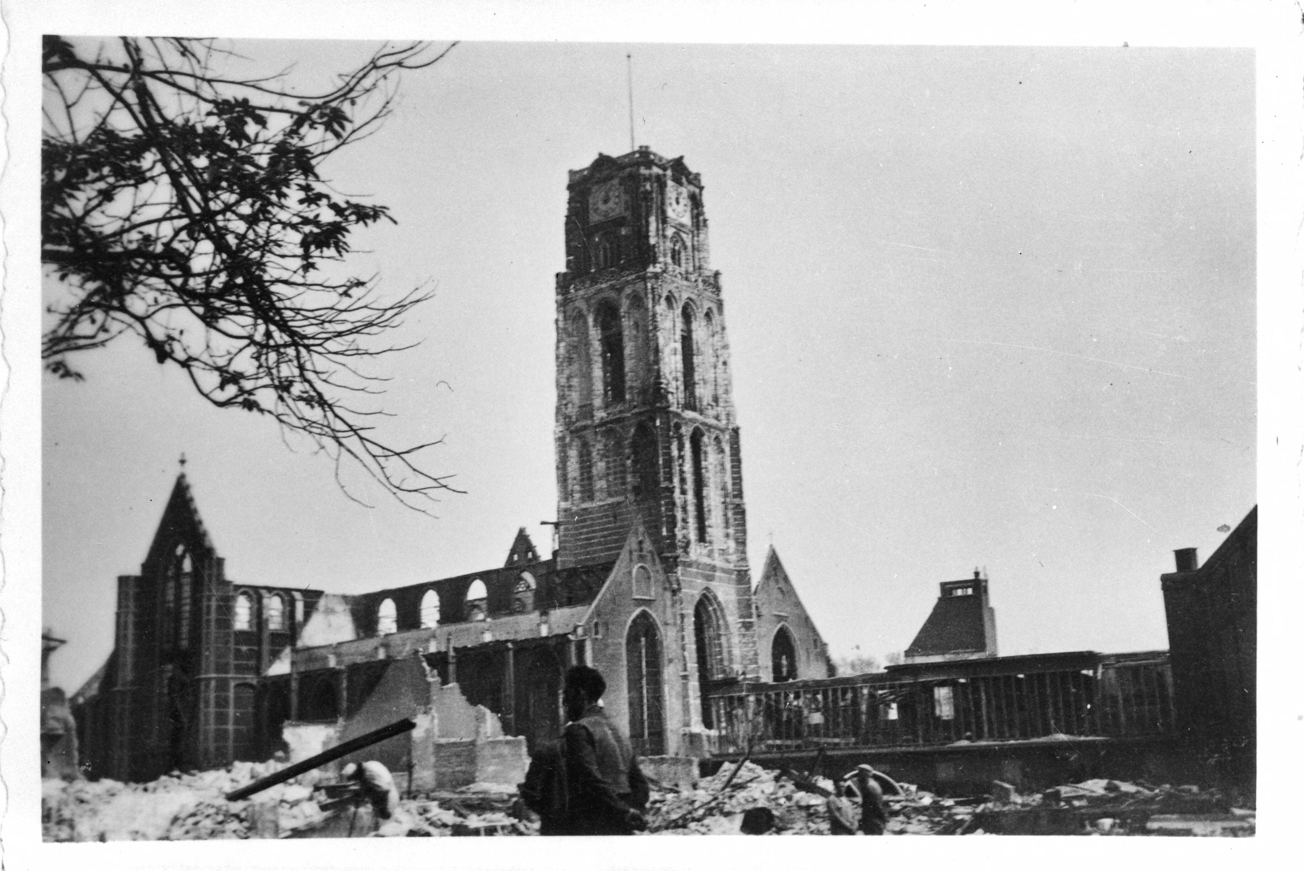 Repro Laurenskerk en omgeving na bombardement Rotterdam mei 1940