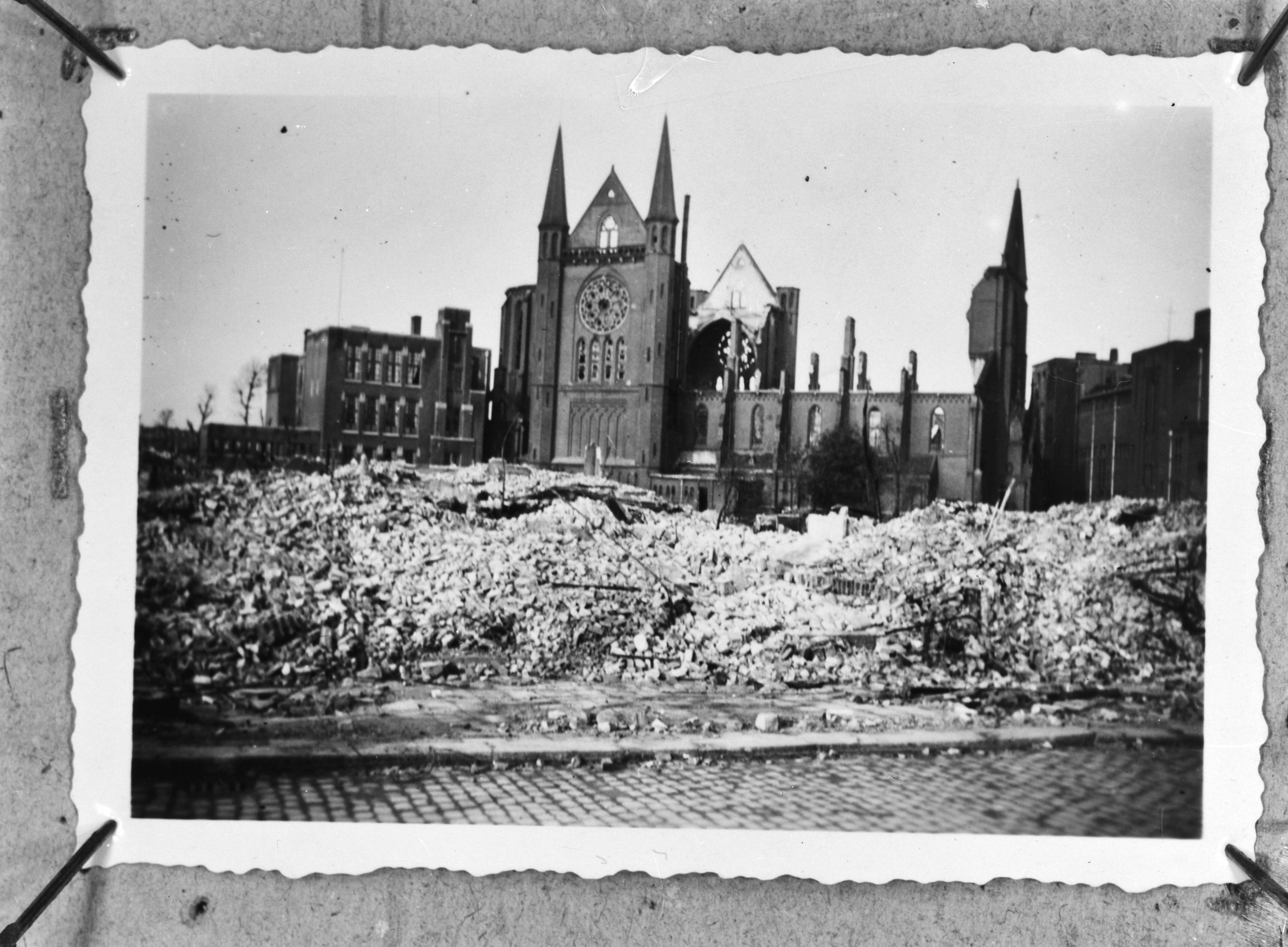 Repro. Rotterdam. De ruine van de H. Hartkerk aan de Van Oldenbarneveltstraat na het bombardement van mei 1940