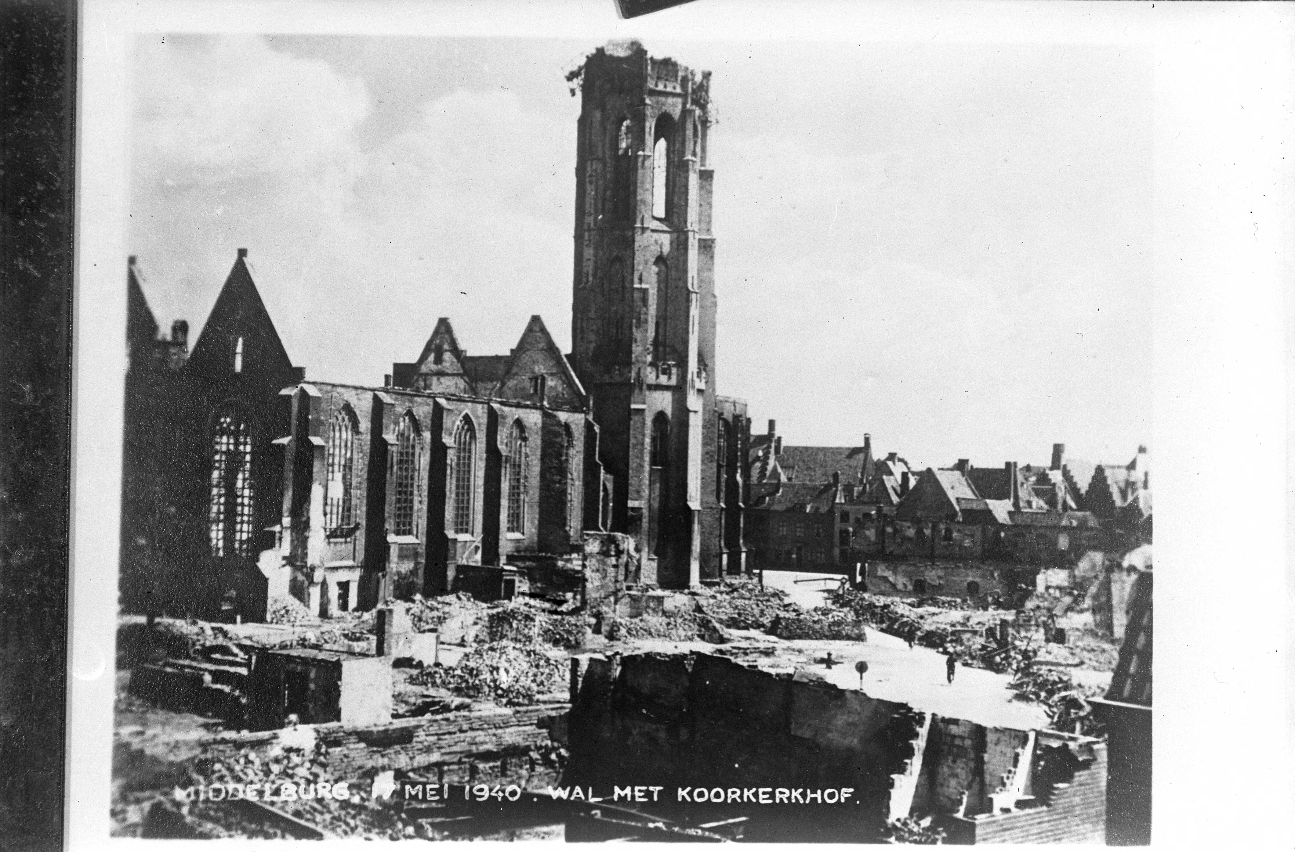 Verwoestingen in Middelburg na bombardement op 17 mei 1940. Het Koorkerkhof
