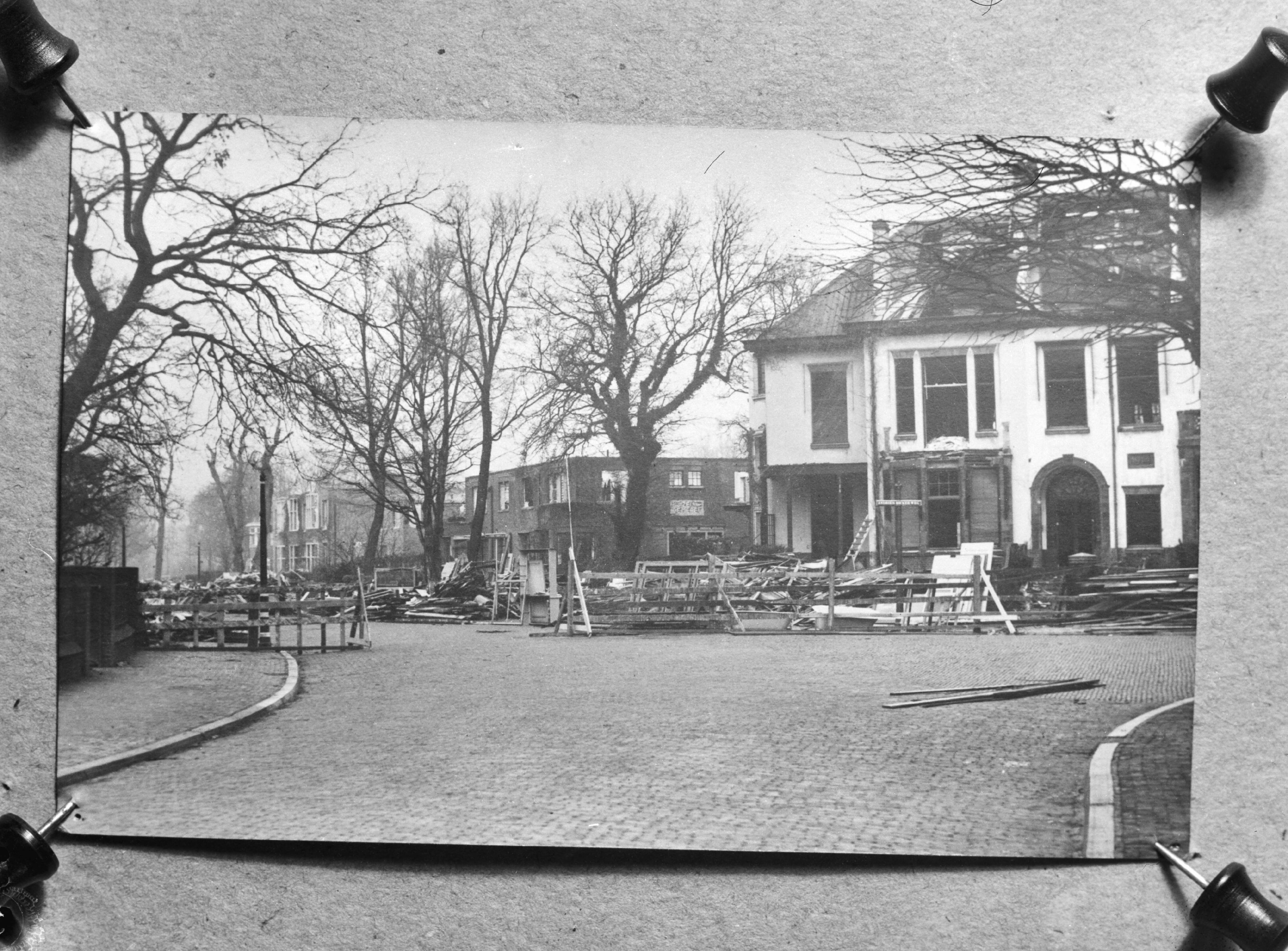 Den Haag. Afbraak voor bouw Atlantikwall. R.J. Schimmelpennincklaan hoek Andries Bickerweg, in afbraak. Uiterst rechts de deur van Andries Bickerweg 9, links daarvan R.J. Schimmelpennincklaan 7