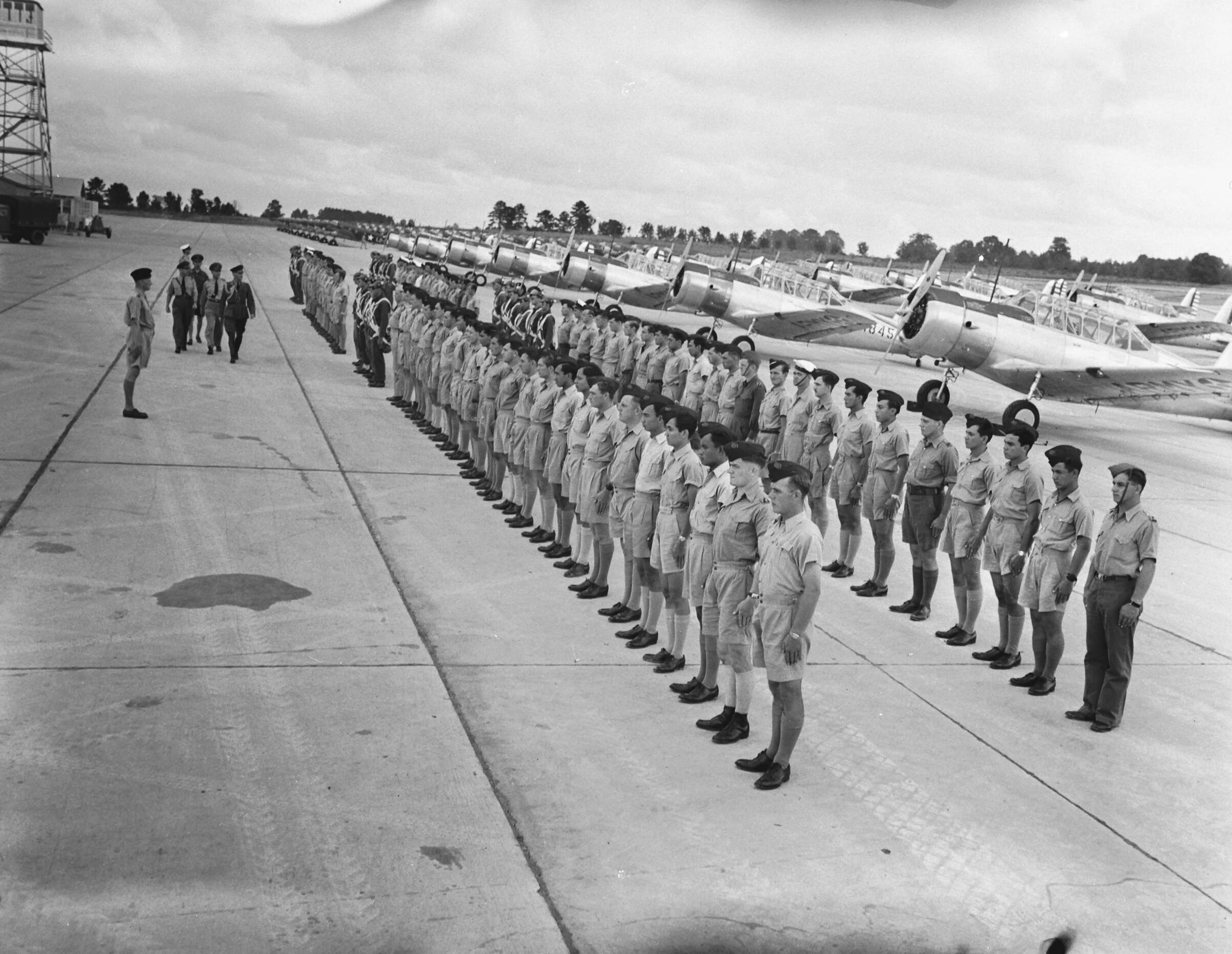 Piloten van de ML-KNIL, onder commando van generaal-majoor L.H. van Oyen, die zijn ontsnapt uit Nederlands-Indië krijgen een opleiding in Fort Jackson, Mississippi. Nederlandse en Indonesische vliegers staan opgesteld voor inspectie door generaal Van Oyen