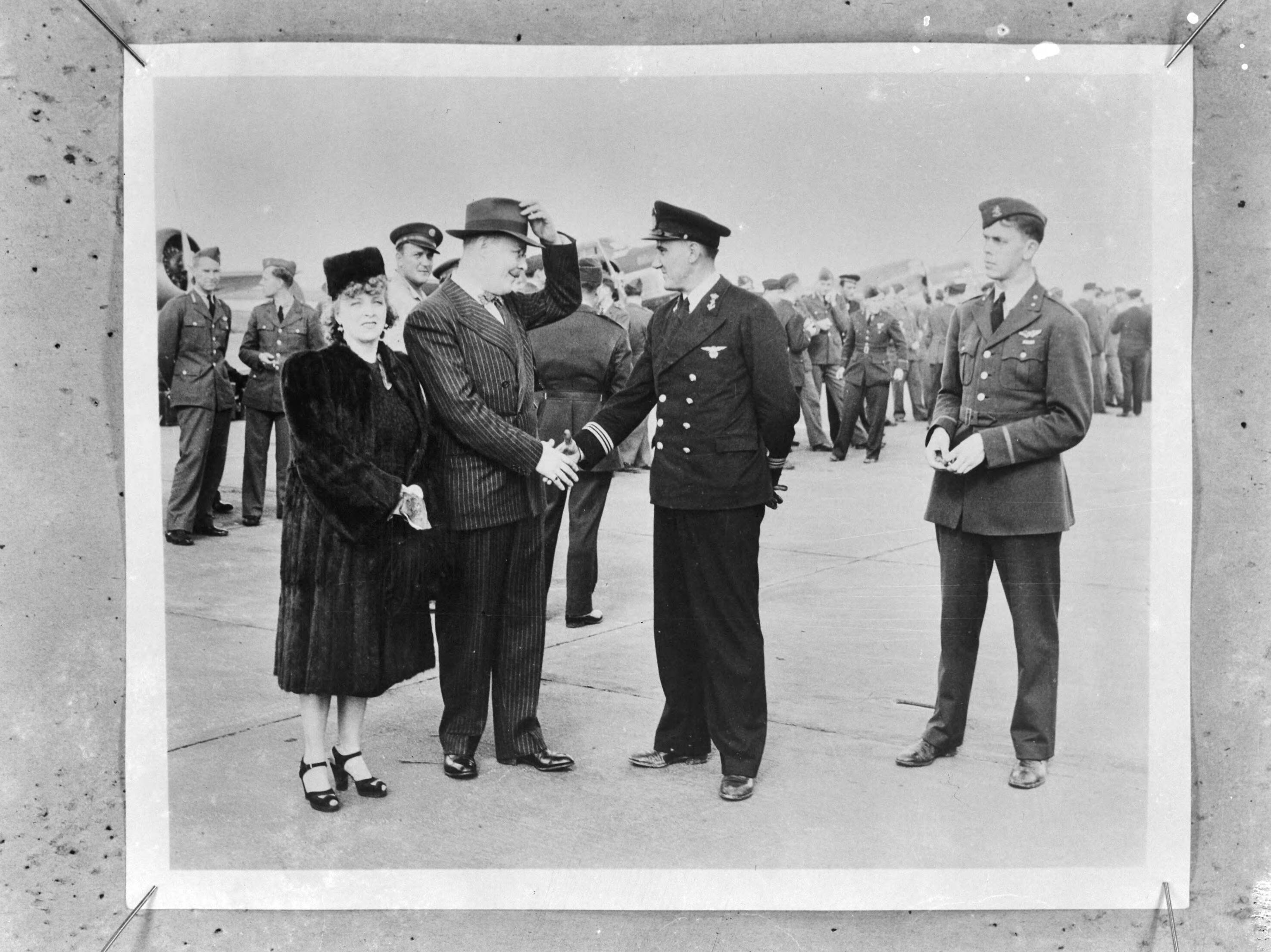 Verwelkoming op het vliegveld Minesfield in Los Angeles. Dr. A. Hartog, Nederlands consul, verwelkomt groep Nederlandse vliegtuigbemanningen. Hier schudt hij de hand van de commandant N. Guilonard