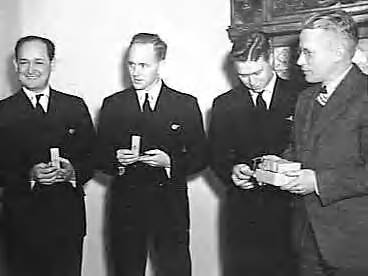 Consul-generaal T. Elink Schuurman deelt souvenirs uit aan Amerikaanse piloten die prinses Juliana naar Suriname hebben gevlogen