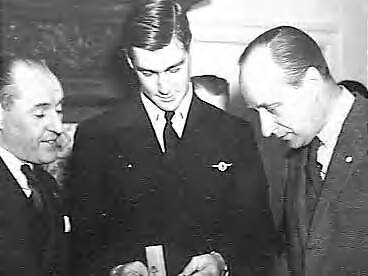 Consul-generaal T. Elink Schuurman deelt souvenirs uit aan Amerikaanse piloten die prinses Juliana naar Suriname hebben gevlogen