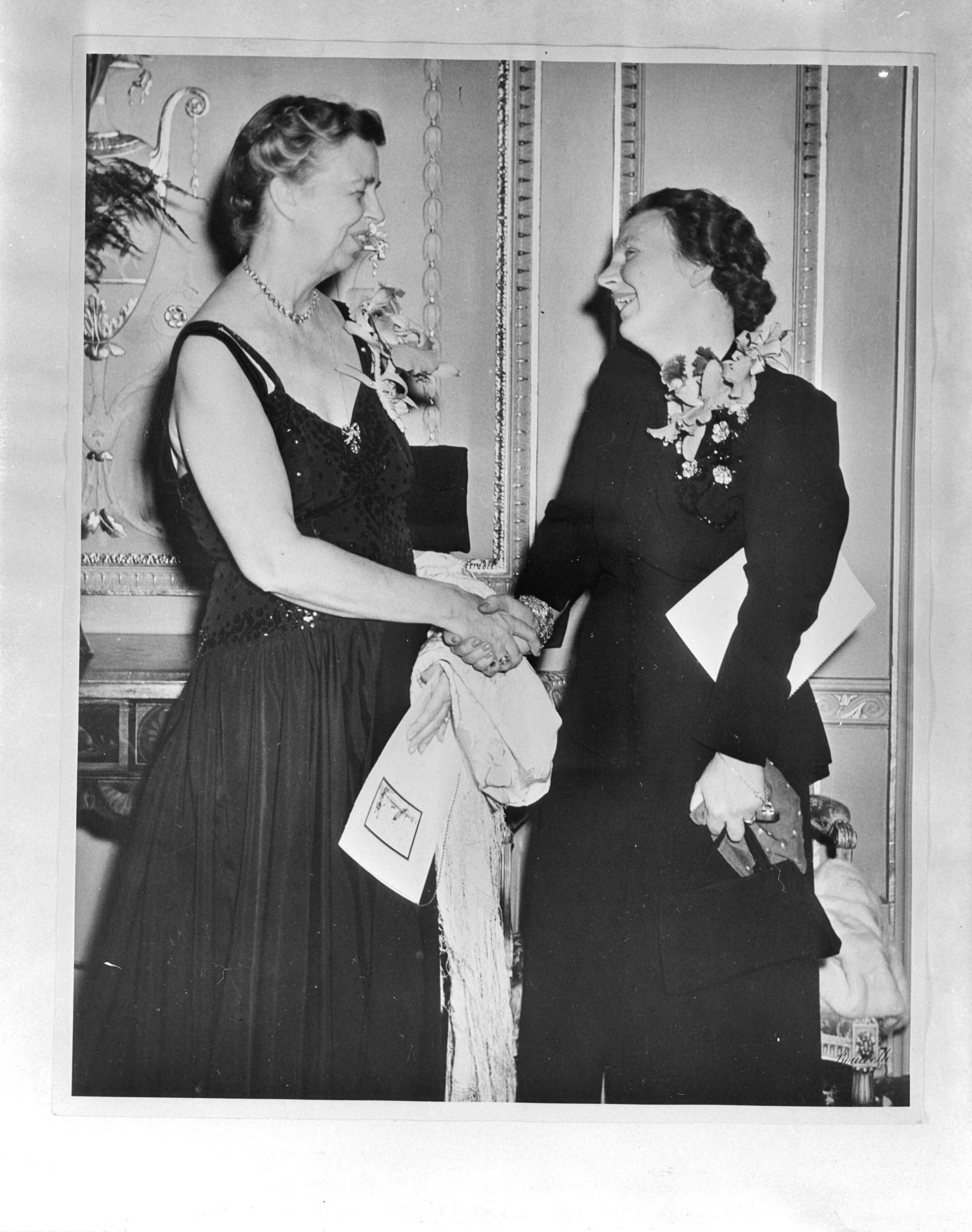 Prinses Juliana (rechts) schudt de hand van Eleanor Roosevelt tijdens een diner van de Netherland America Foundation in het Waldorf Astoria hotel te New York