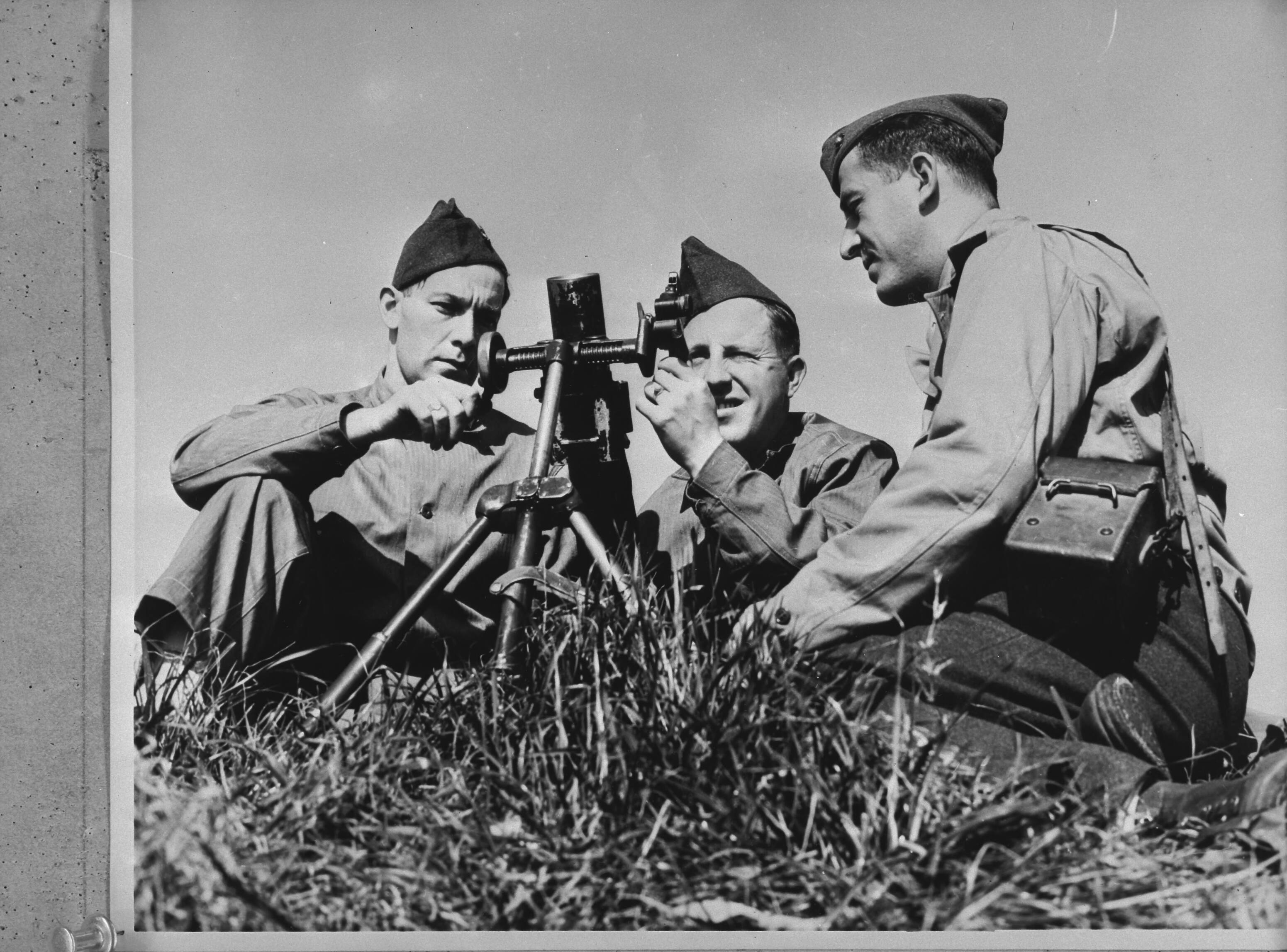 Serie Training in Camp Lejeune voor Nederlandse mariniers. Twee Nederlandse mariniers bezig met een 60mm mortier, toegekeken door hun instructeur sergeant Benjamin F. Morgan