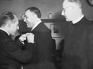 De voorzitter en de directeur van het Seaman's Church Institute in New York City ontvingen de onderscheiding van Officier in de Orde van Oranje-Nassau. De Nederlandse consul-generaal T. Elink Schuurman (links) speldt de decoratie op het rever van voorzitter Clarence G. Michalis. Rechts de directeur dominee dr. Harold H. Kelley