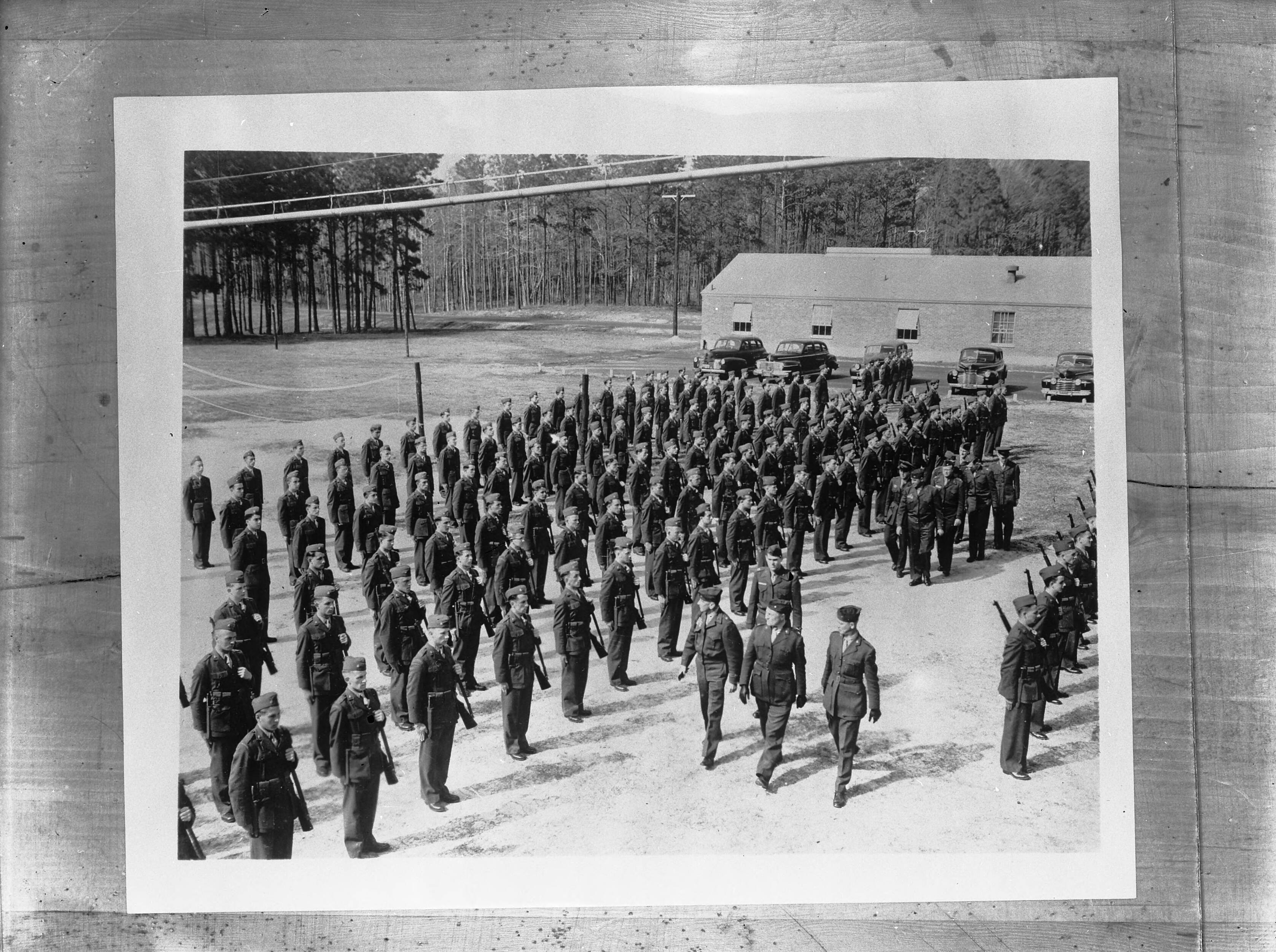 Korps Mariniers in Camp Lejeune (North Carolina). Brigade-generaal Alfred H. Noble (links), commandant van het Marine Trainings Commando te Camp Lejeune inspecteert een gedeelte van het detachement Verenigde Staten van het Korps Mariniers, begeleid door luitenant-kolonel L. Langeveld, commandant van het detachement Korps Mariniers en majoor Jacobus J. Honig, commandant van het Eerste Trainings bataljon. De staf van generaal Noble volgt de inspecterende officieren