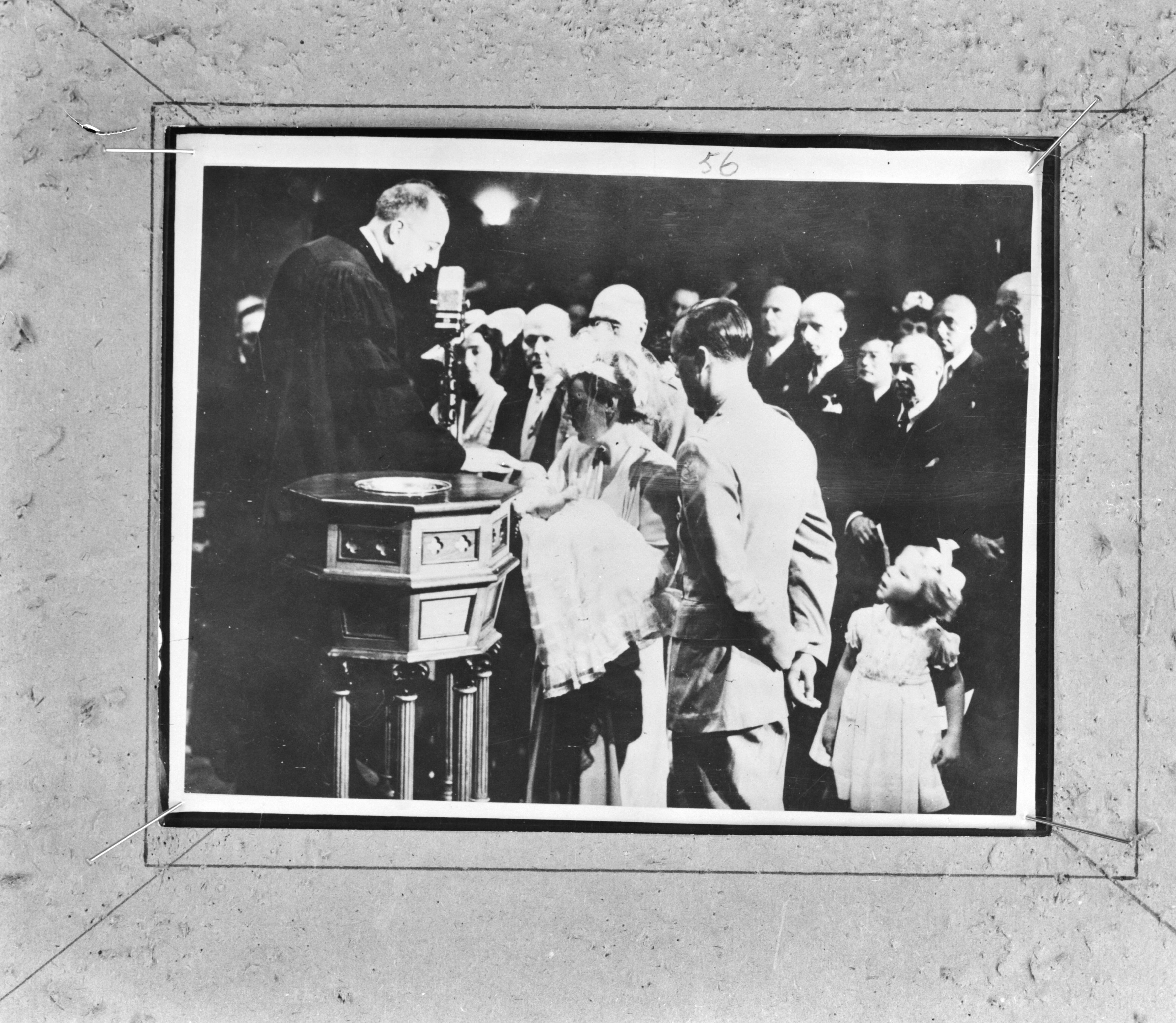 Doop van prinses Margriet in de St. Andrews Presbyterian Church te Ottawa, tijdens een dienst geleid door ds. Winfield Burggraaff, aalmoezenier van de Nederlandse Marine. De ceremonie werd bijgewoond door koningin Wilhelmina, prins Bernhard, de graaf van Athlone (gouverneur-generaal van Canada), prinses Alice, de Canadese premier W.L. Mackenzie King en leden van het Corps Diplomatique