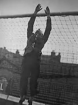 Voetbalwedstrijd tussen België en Nederland op Griffin Park te Brentford. De Nederlandse keeper, soldaat W. Brinkman test het doel