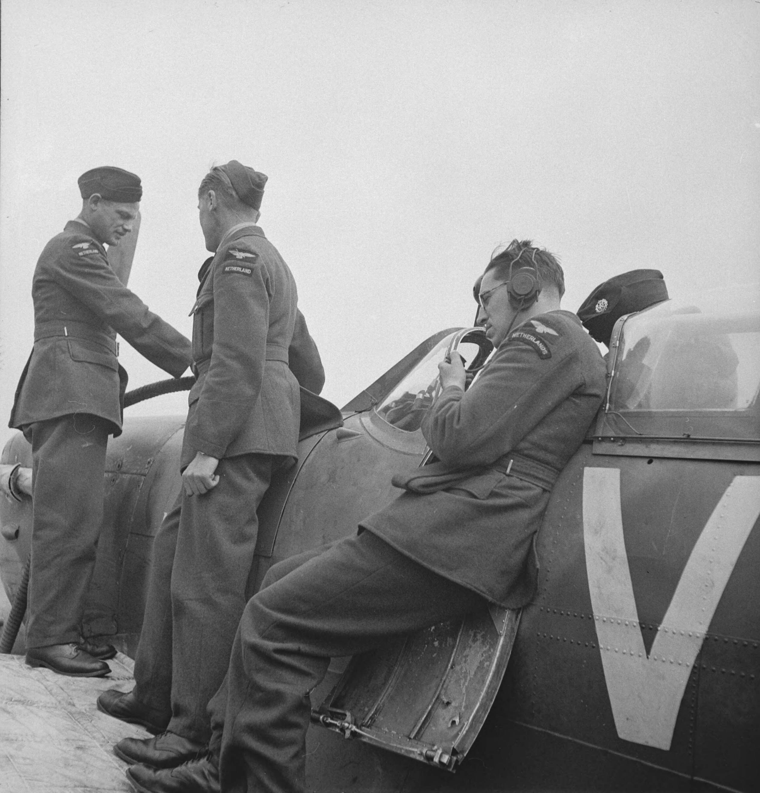 Bijschrift "Everyting being got ready for another sortie, refuelling Spitfire" Alles wordt klaargemaakt voor een nieuwe missie, bijtanken Spitfire
