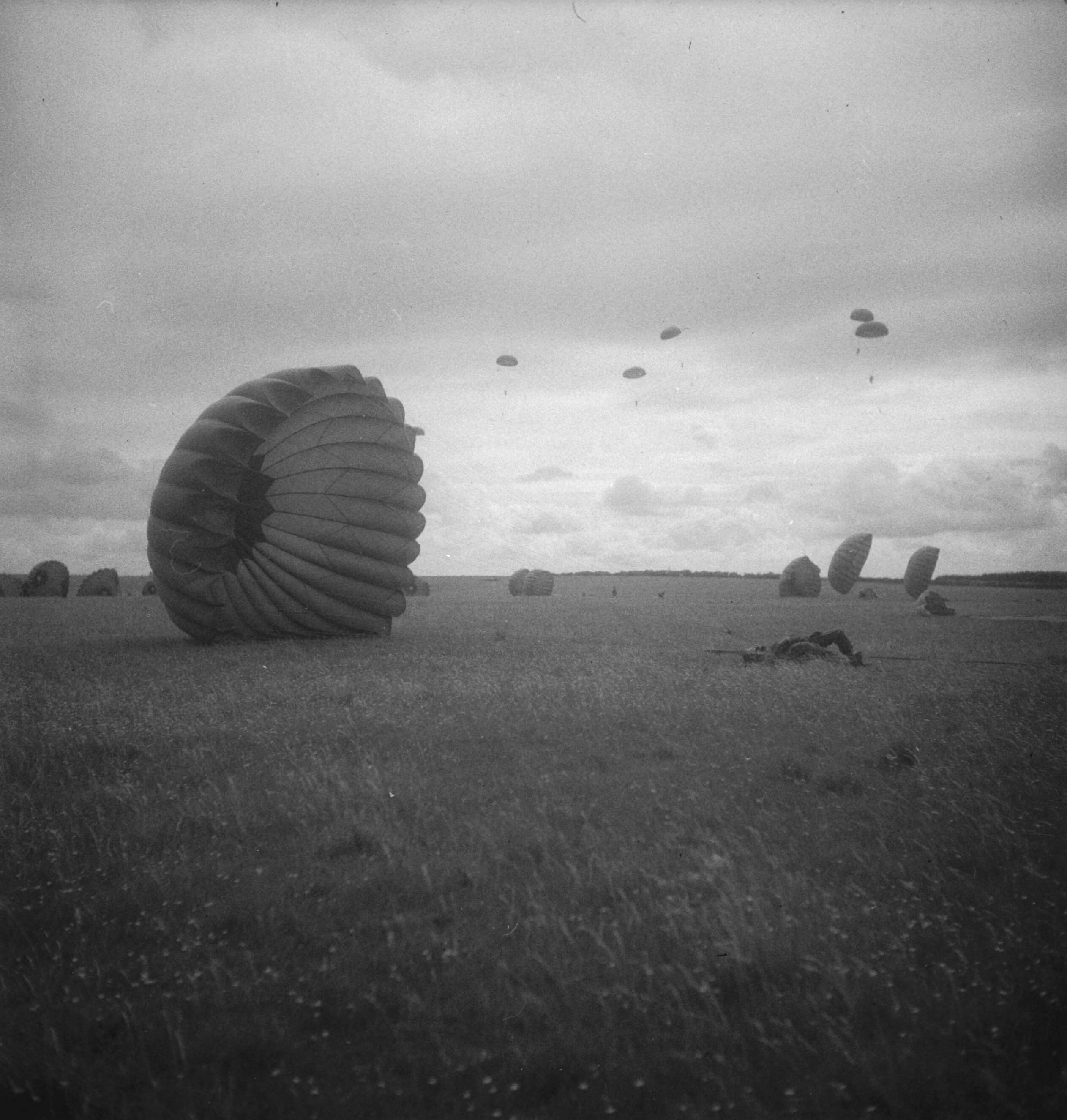 Nederlandse soldaten worden door de RAF getraind als parachutisten. Landing van parachutisten