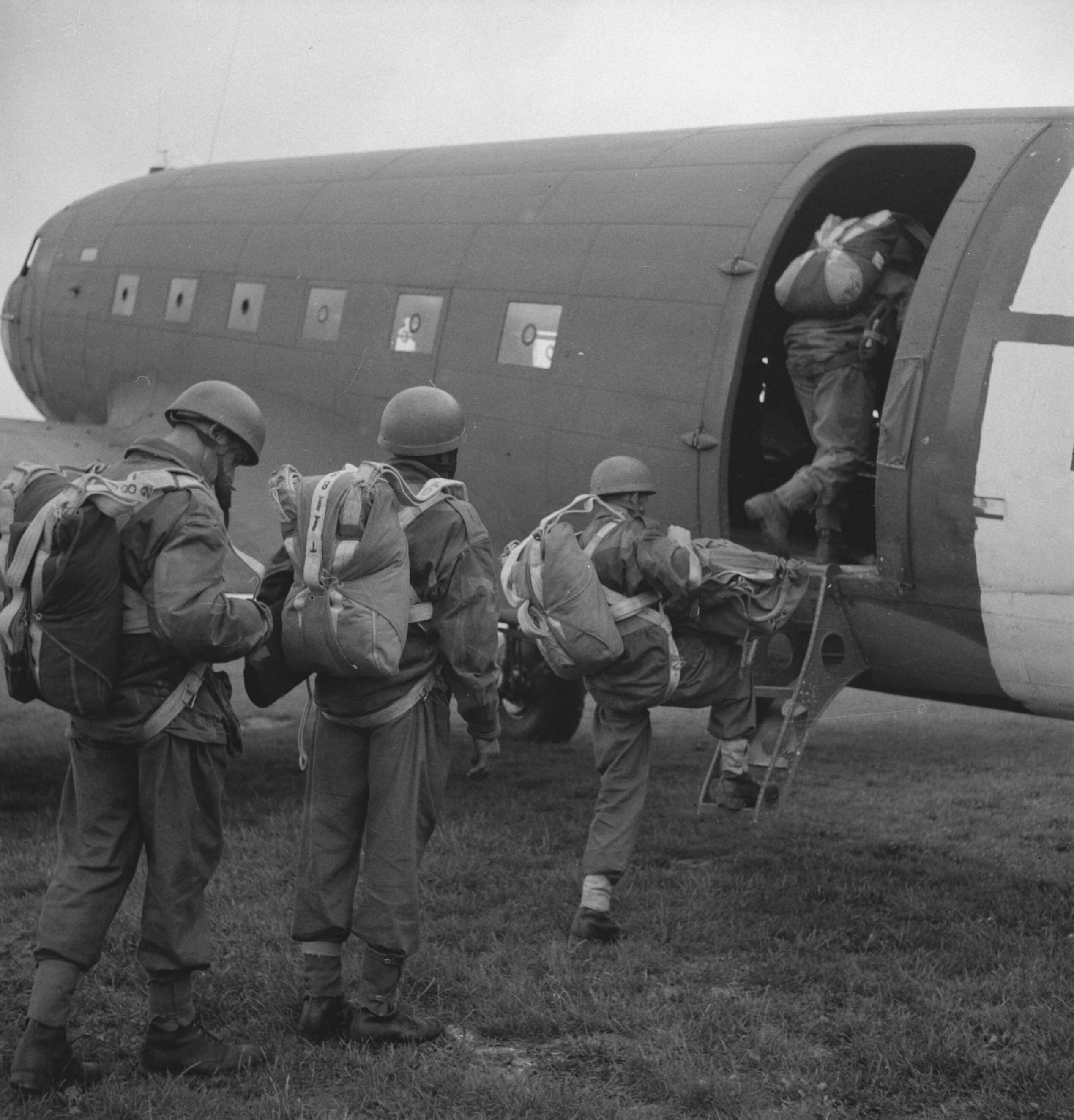 Nederlandse soldaten worden door de RAF getraind als parachutisten. De parachutisten in opleiding stappen in een vliegtuig een Dakota