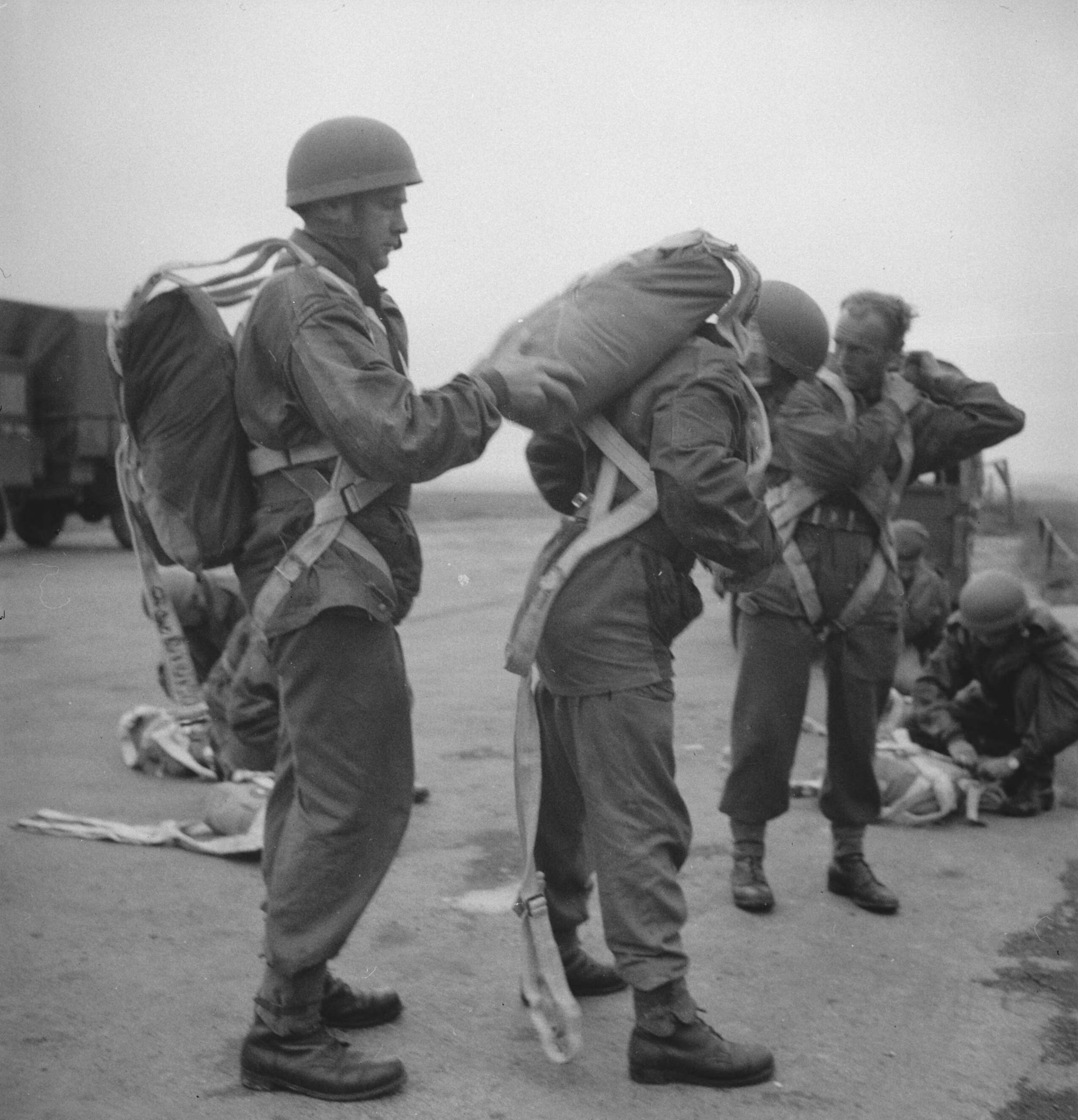 Nederlandse soldaten worden door de RAF getraind als parachutisten. De parachutes worden vastgemaakt